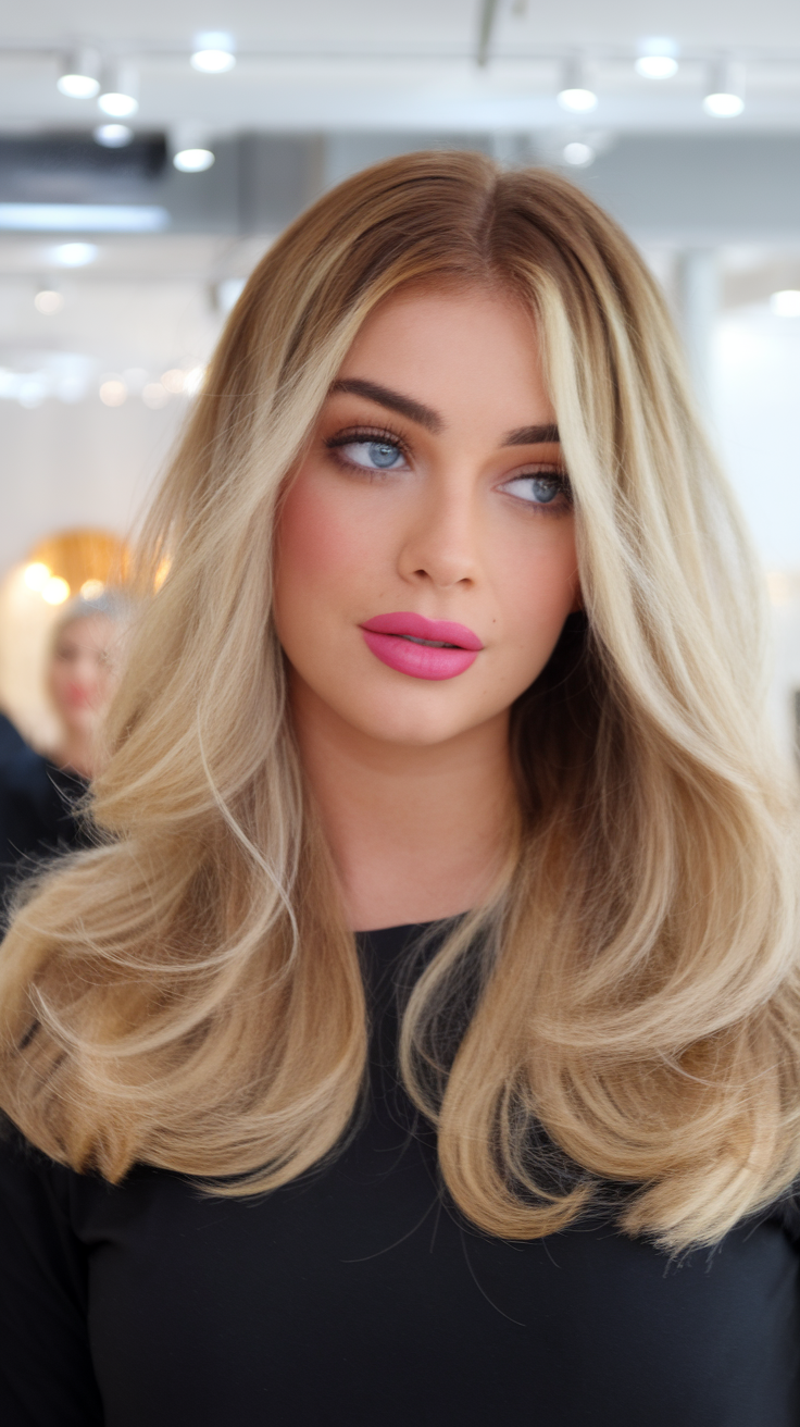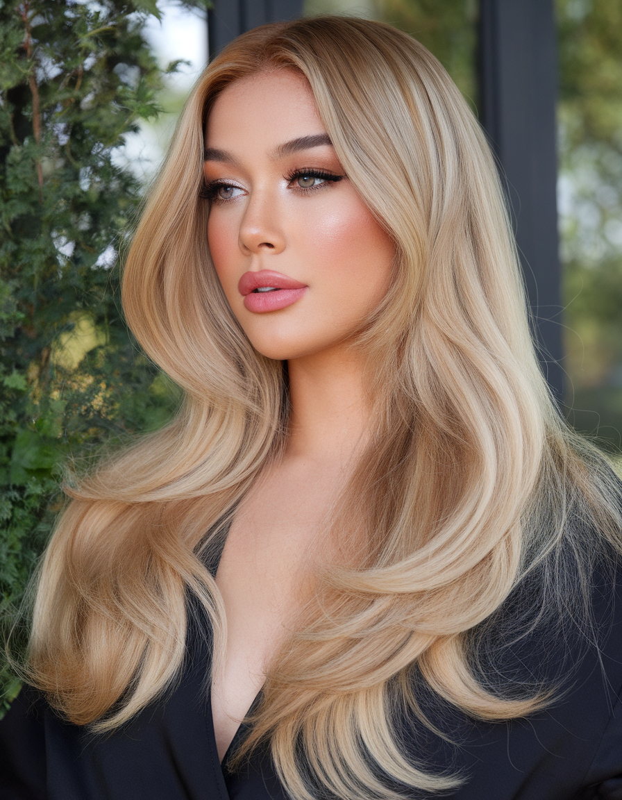 This long hair look is styled with voluminous layers, giving a salon-quality blowout effect. The soft honey-blonde color complements the layers, enhancing shine and dimension. The smooth yet bouncy texture creates a full-bodied appearance, making this a luxurious medium length hairstyle. Ideal for those seeking a polished and elegant look that enhances oval face features.