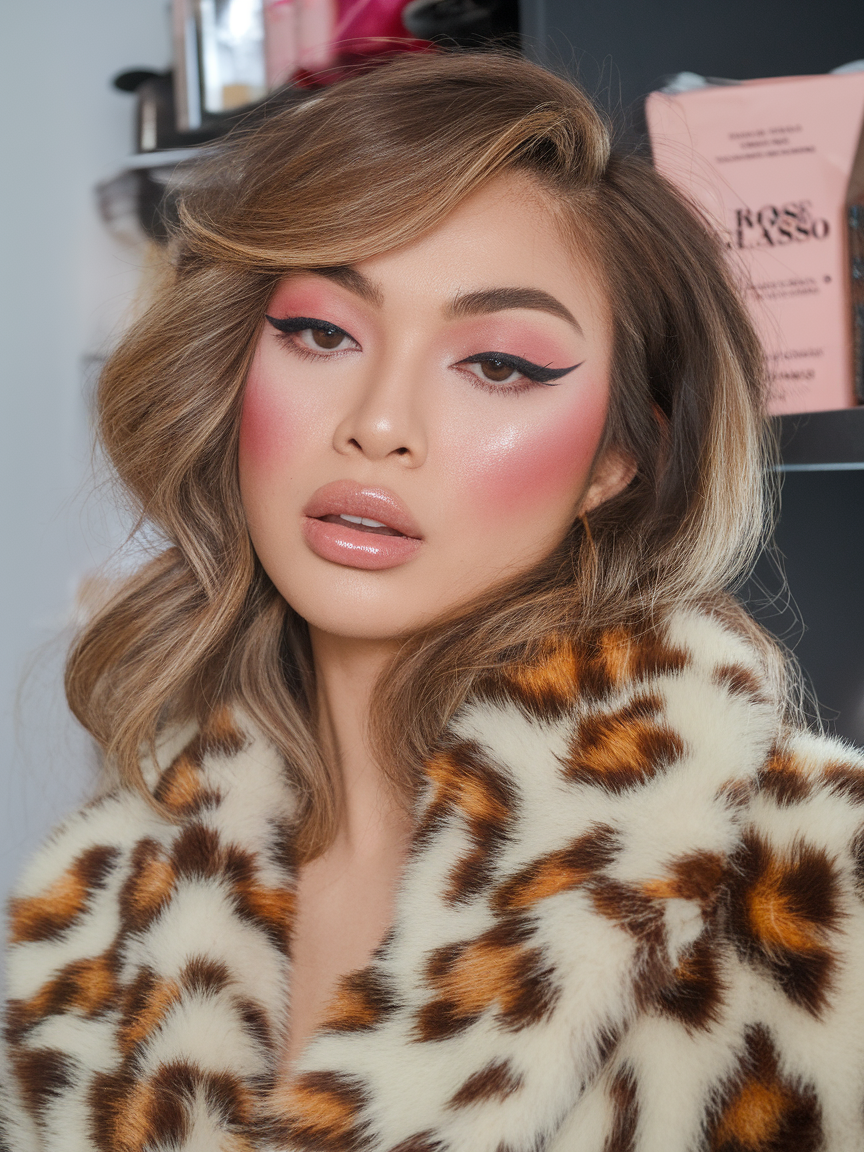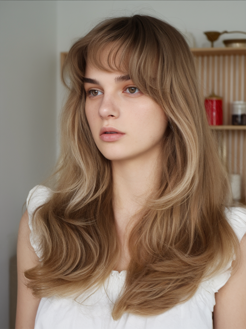 This medium length hairstyle features soft layers that add movement and dimension. The bangs are wispy and lightly feathered, complementing the oval face shape while maintaining a fresh, youthful look. The warm blonde-brown shade enhances the hair’s natural depth and texture. This effortless style is perfect for those who want a balanced mix of volume and elegance.