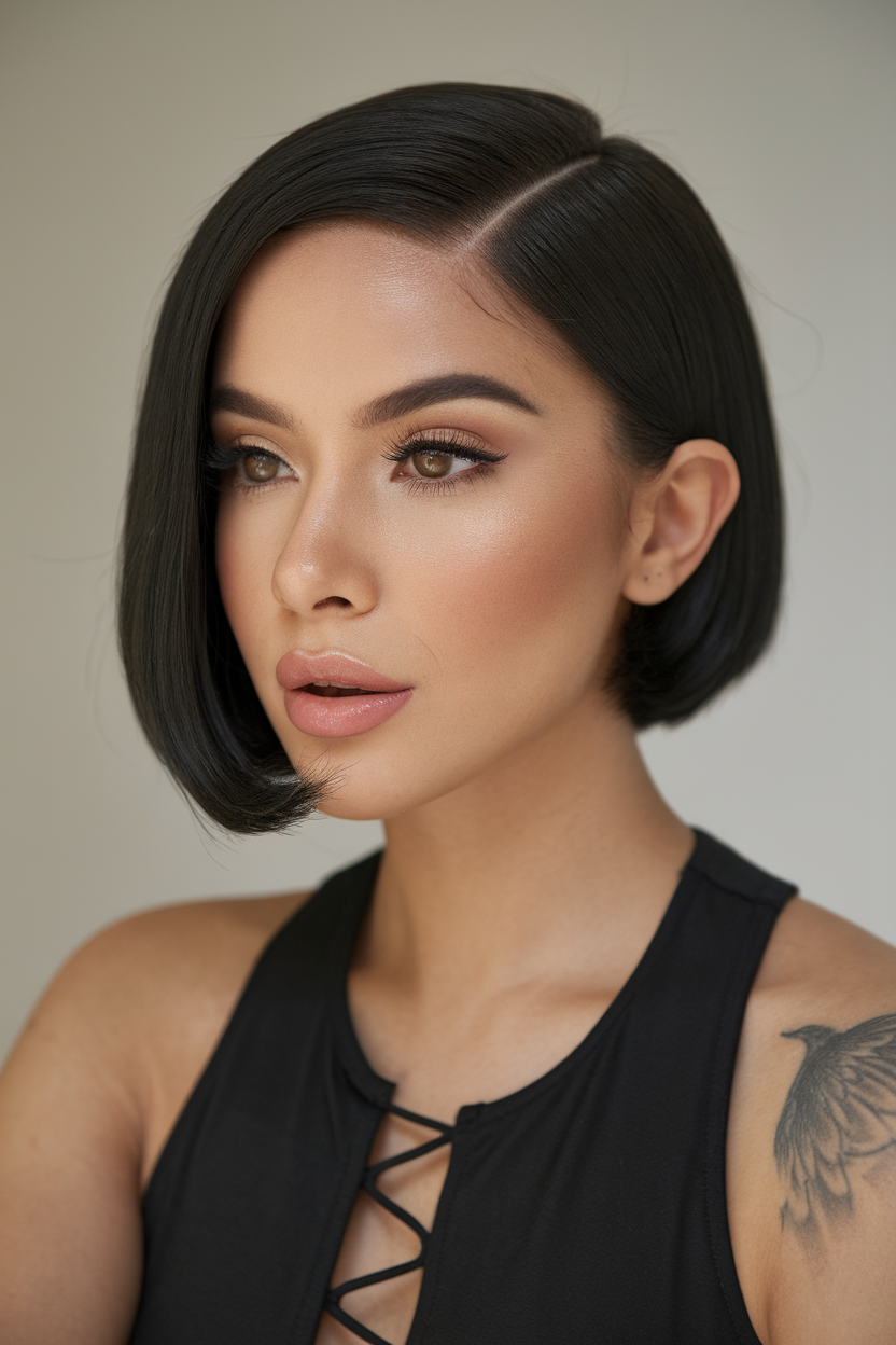 This short straight hairstyle features a sharply defined bob with an asymmetrical finish. The sleek black color enhances shine and gives a bold, dramatic effect. A deep side part adds volume and frames the oval face shape beautifully. This spring haircut is perfect for those who love a sleek, fashion-forward look.