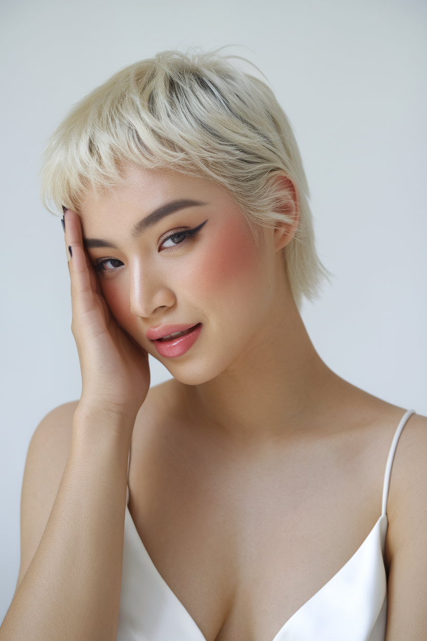 This short length hairstyle is a playful and edgy pixie cut with feathered bangs. The platinum blonde shade makes the cut even more striking, giving it a fresh and modern feel. The choppy layers add volume and texture, making this spring haircut a bold choice for those who love a daring yet stylish look. A great option for an oval face shape wanting a confident, trendy vibe.