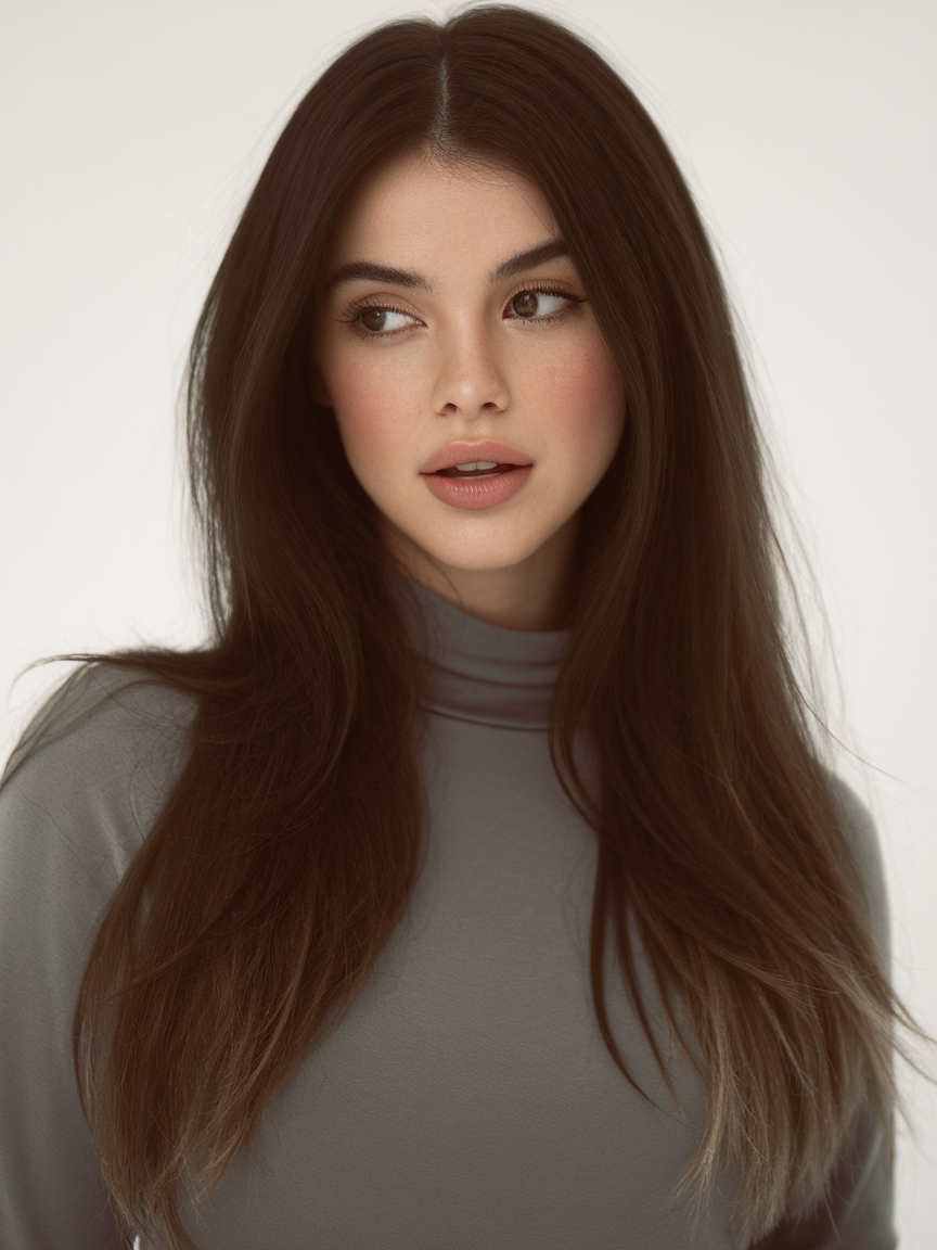 This long hair look features deep brunette tones with subtle golden highlights, creating a natural sun-kissed effect. The soft waves add texture and movement, enhancing the volume without overwhelming the oval face shape. The slightly tousled finish makes it a perfect spring haircut for those who prefer a relaxed yet polished style. This effortless cut is ideal for everyday wear with a touch of elegance.