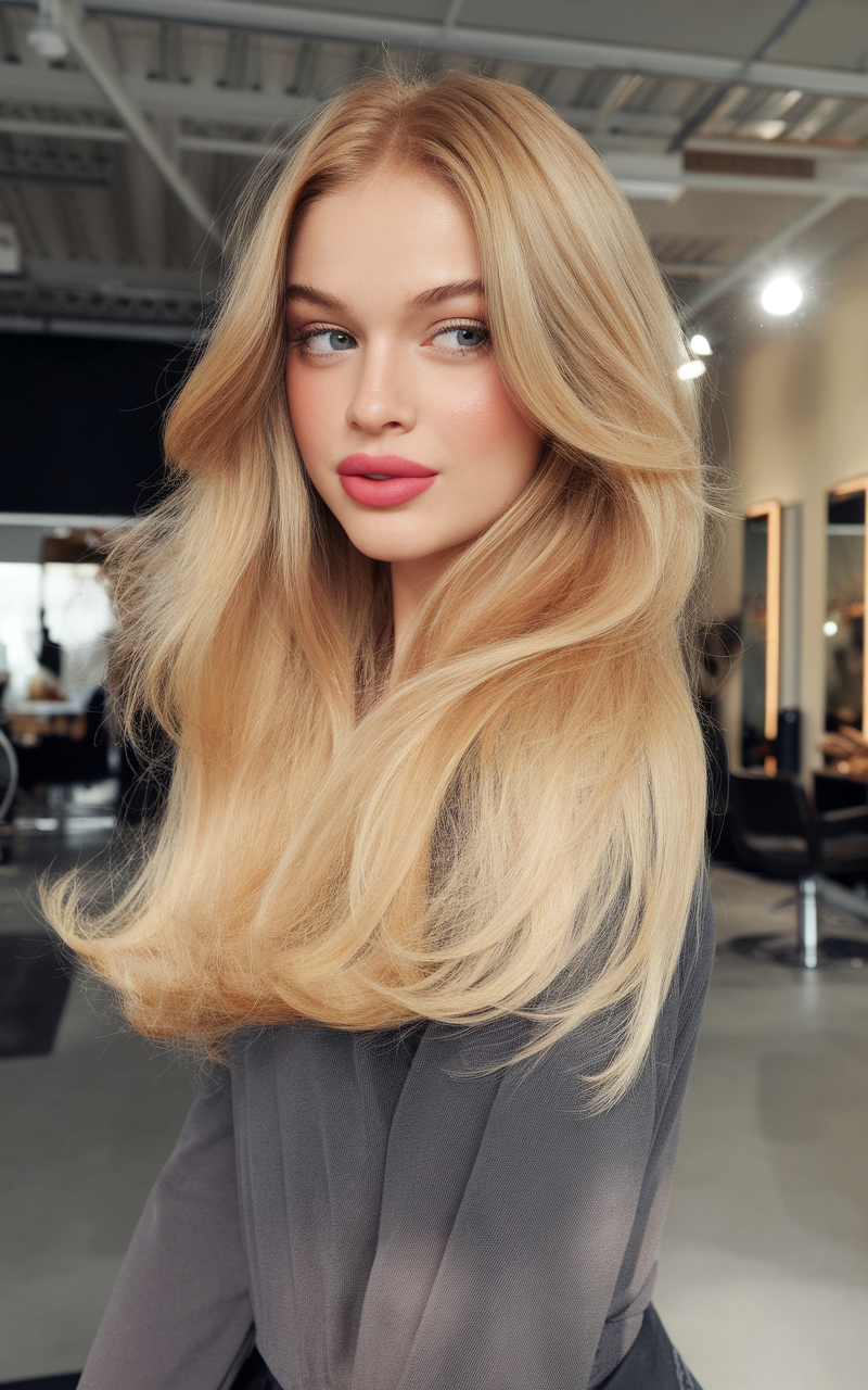 This long hair style is designed with a voluminous blowout effect, creating a glamorous yet natural shape. The golden blonde hue with soft highlights enhances dimension, making the hair appear fuller. The face-framing layers complement an oval face shape, adding balance and structure. This spring haircut is perfect for those who love a sophisticated yet effortless style.