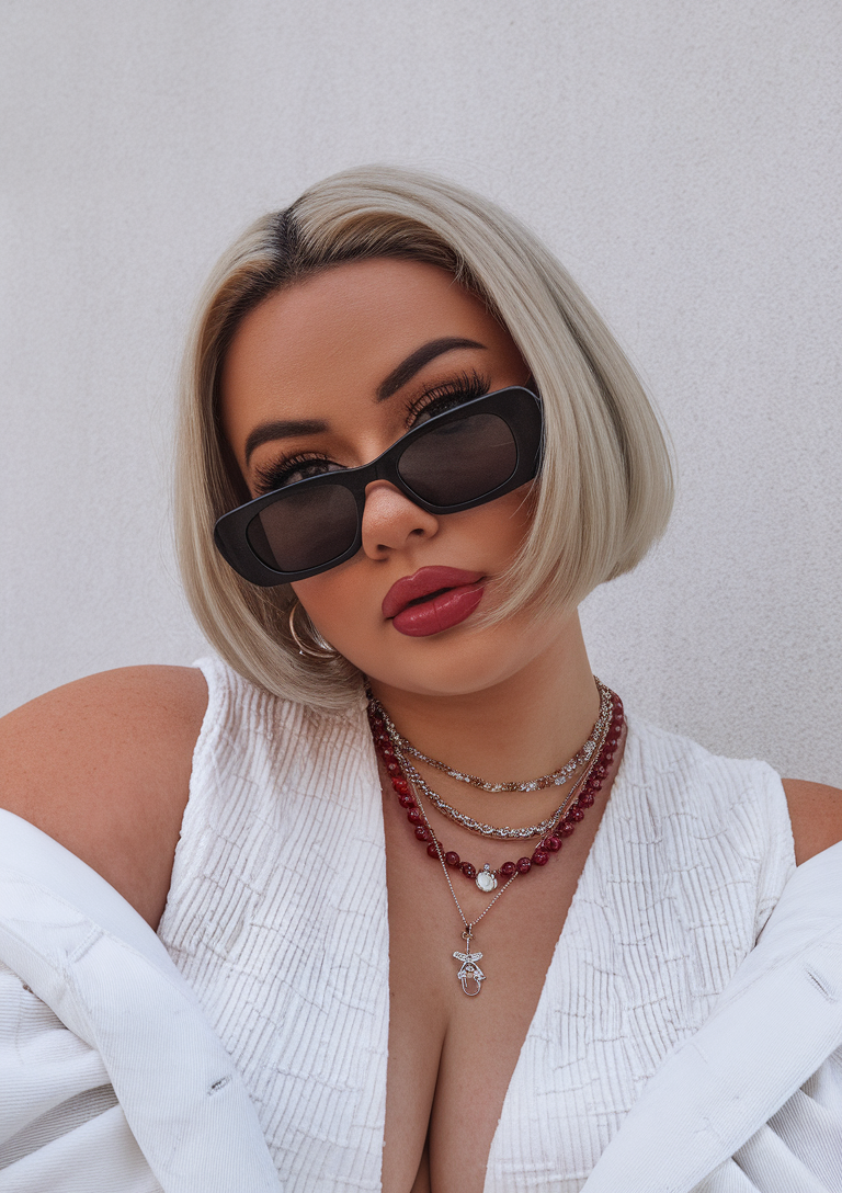 This bob features a sharp, sleek cut with a deep platinum blonde tone for a bold, modern look. The subtle inward curve at the ends adds softness, making it a flattering choice for round faces. A stylish and cool option for those who love a polished, edgy style.