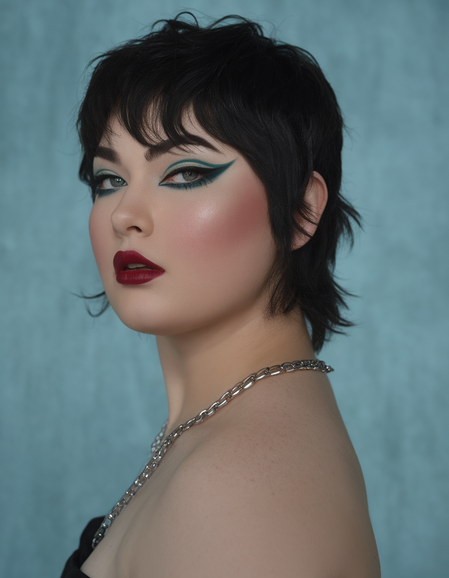 This pixie mullet blends short choppy layers with longer textured ends for a bold, punk look. The deep black color enhances the sharp, masculine style while maintaining a touch of softness. A great option for those looking for a cool, fashion-forward haircut.