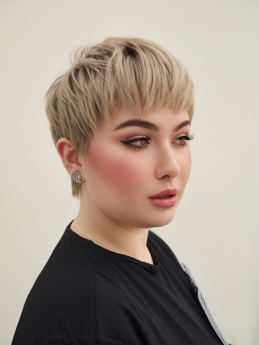 This ultra short pixie features soft, feathered layers that add volume and movement. The light blonde shade gives it a modern and flattering touch, making it ideal for round faces. A chic and effortless choice for those looking for a stylish, short tomboy cut.