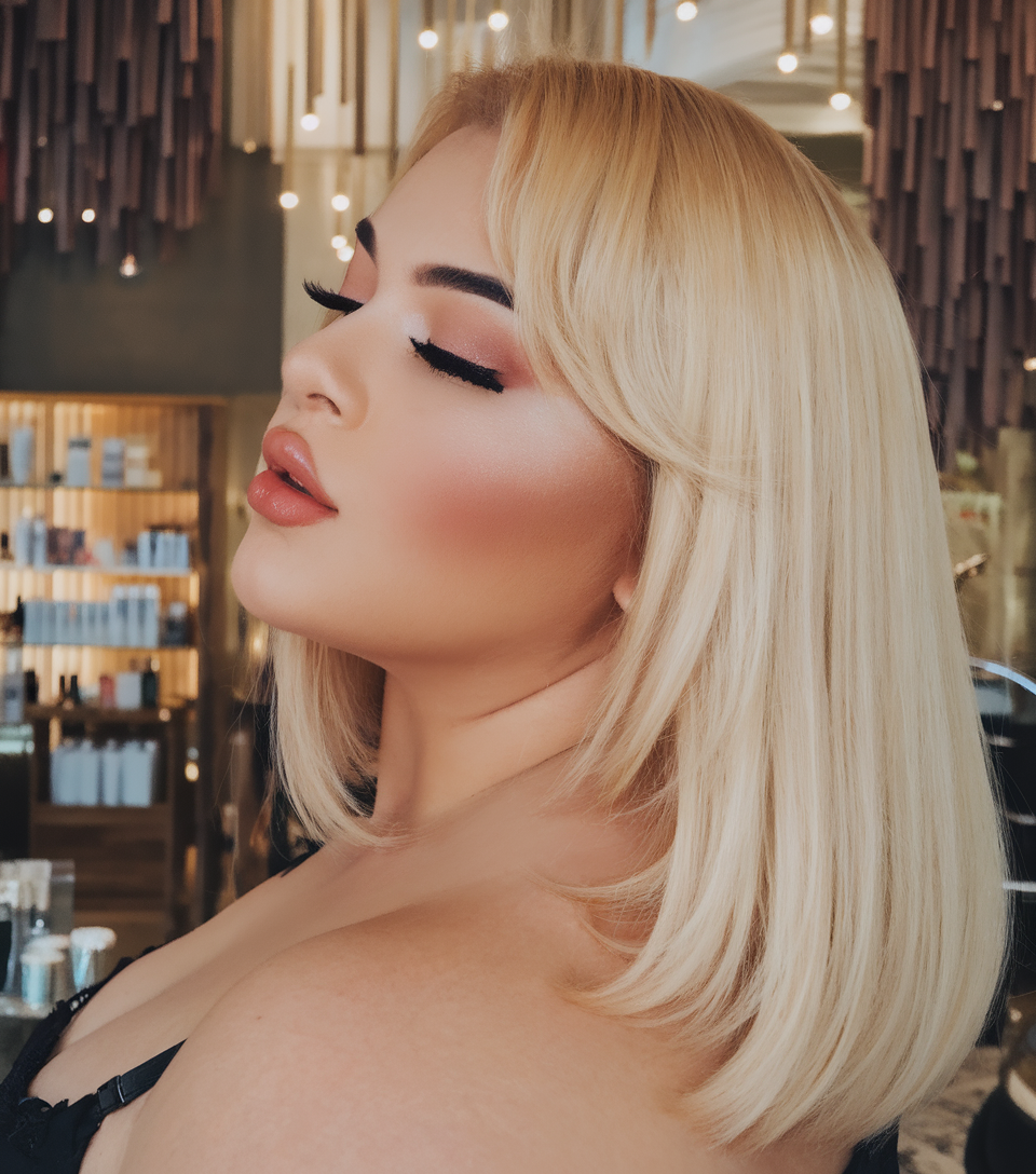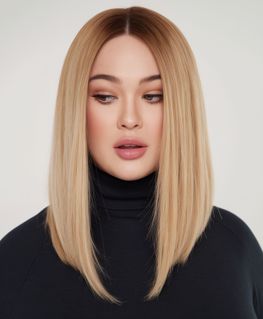 This lob is styled sleek and straight, with soft layered ends for movement. The warm blonde shade and subtle bangs create a modern and flattering effect. A polished and cute choice for those who love effortless sophistication.