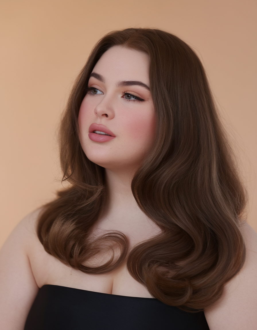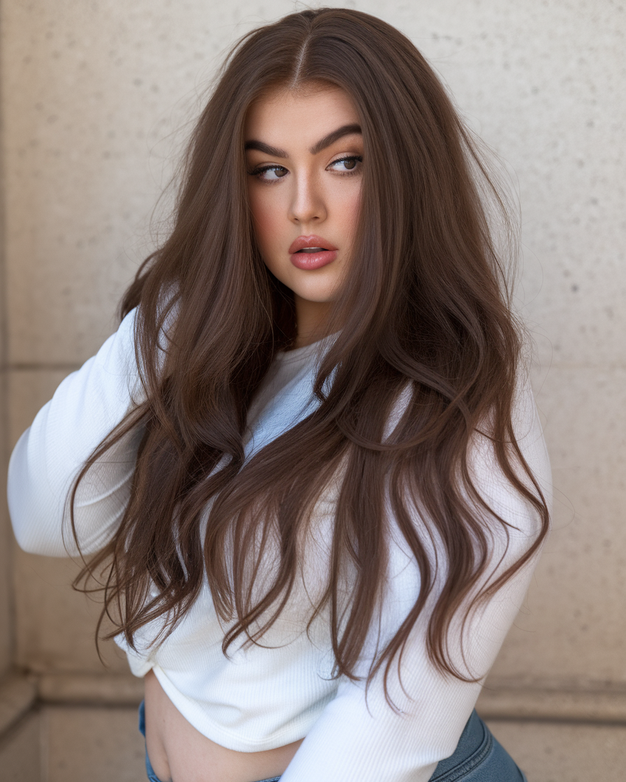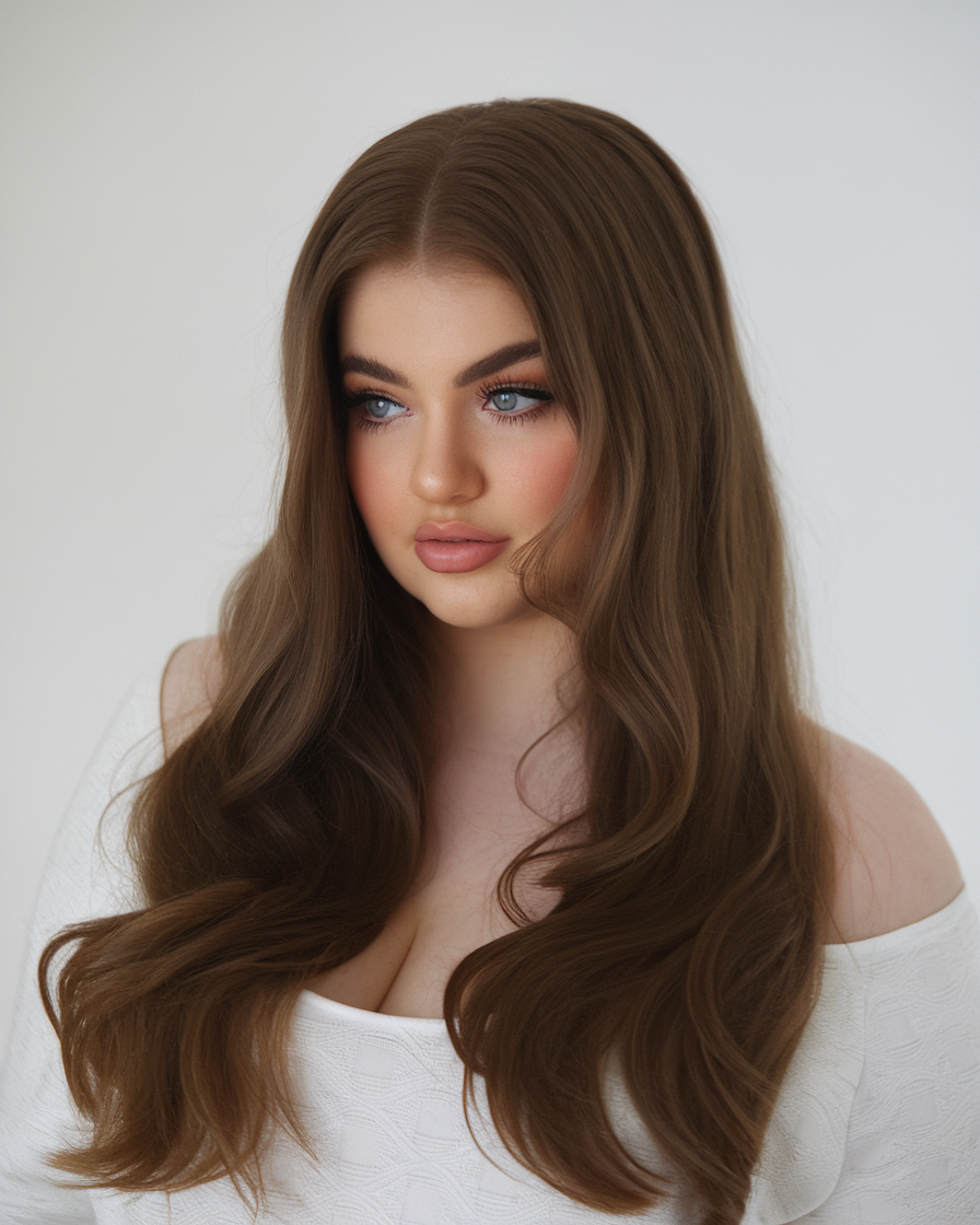 This long hair look is styled sleek at the top with soft, layered waves toward the ends. The warm brown shade adds depth and enhances shine, making it a flattering choice for round faces. A classic and modern style that balances elegance and movement.