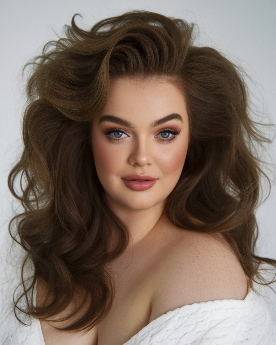 This long hair style features voluminous, layered waves with a soft, natural brunette tone. The lifted roots add height, creating a flattering and glamorous effect. A cool and stylish option for those who love bold, voluminous looks.