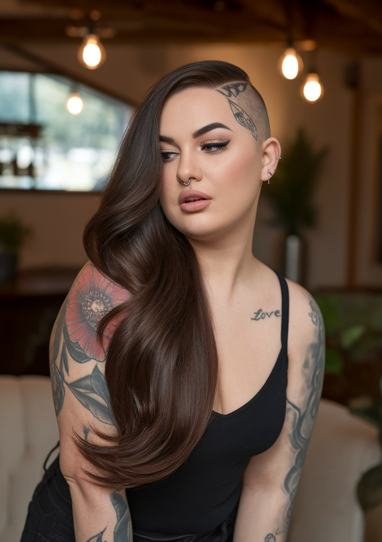 This long hair look combines soft, layered waves with a bold undercut for contrast. The shaved side adds a touch of punk, while the cascading strands keep it feminine and versatile. A great option for those wanting a mix of cool and masculine elements.