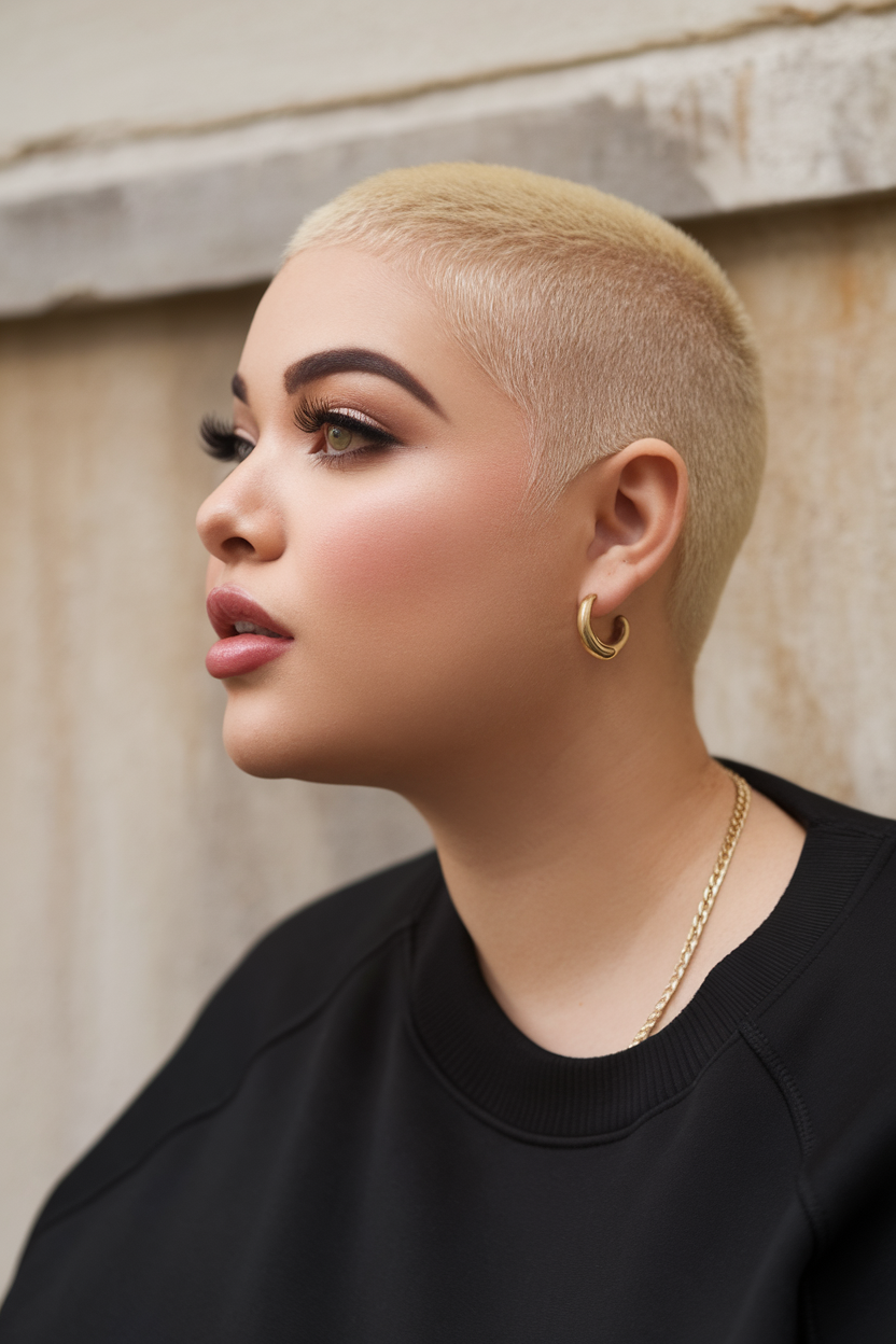 This ultra short pixie is closely cropped for a sleek, masculine finish. The platinum blonde color adds contrast and sharpens the overall modern aesthetic. A confident and cool choice for those who love a short tomboy cut.