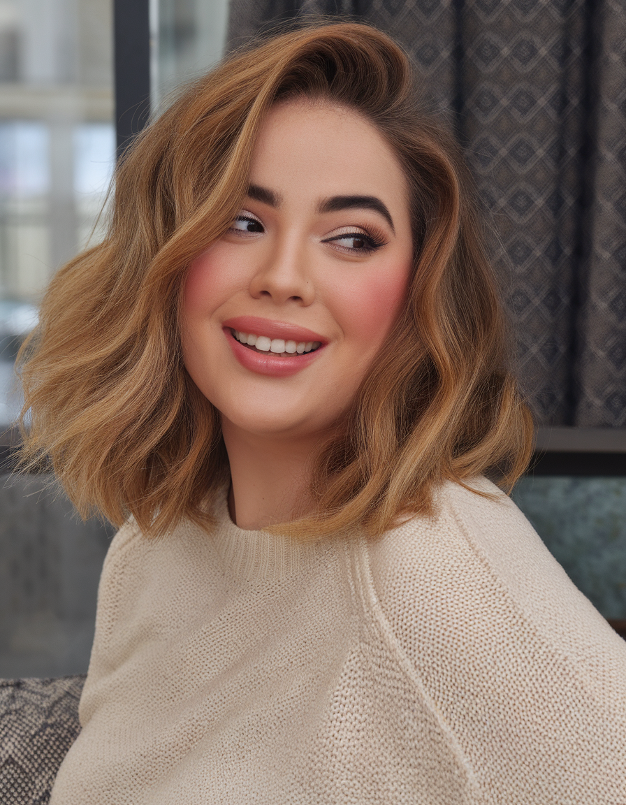 This short bob has a layered structure with a slight wave for added texture and volume. The warm blonde color enhances movement, creating a fresh and cute style. A versatile and flattering cut that works well for round faces shoulder length styles.