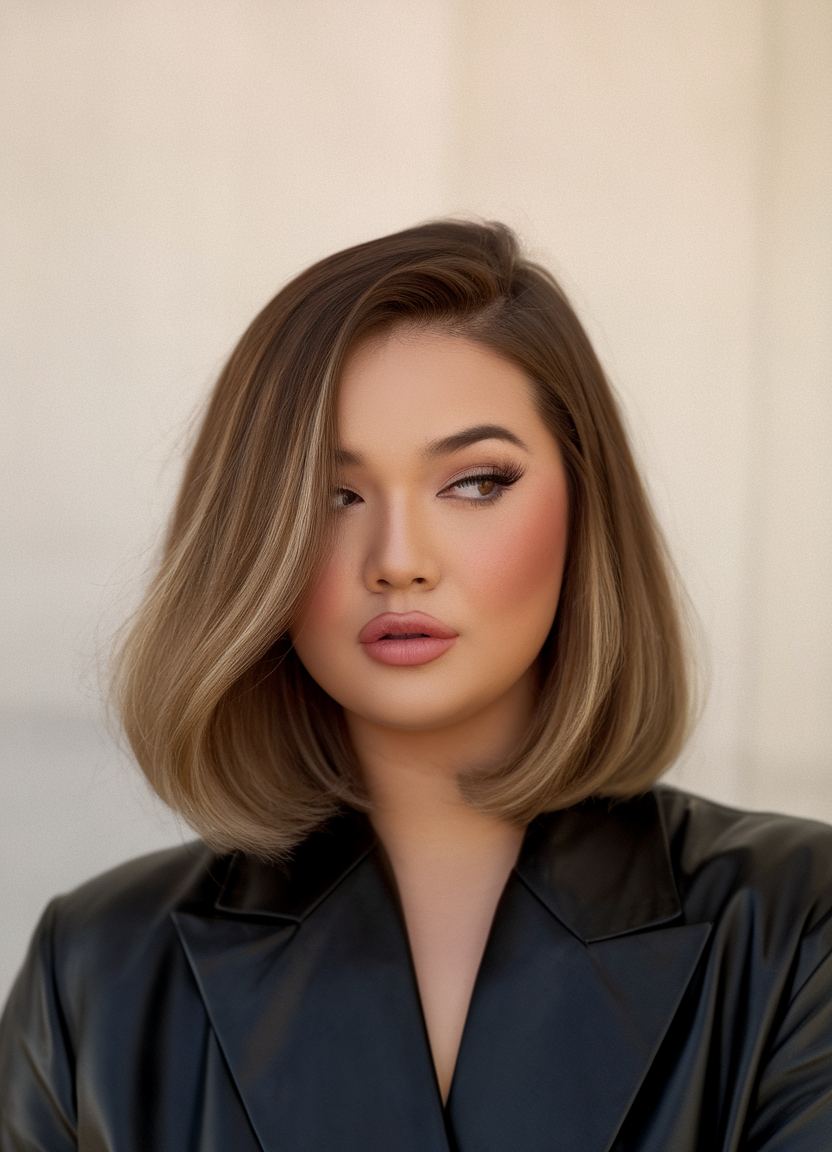 This bob features a structured, medium length cut with a seamless ombre transition. The soft waves at the ends add volume, making it a flattering choice for round faces. A cool and polished option for a modern and sleek style.