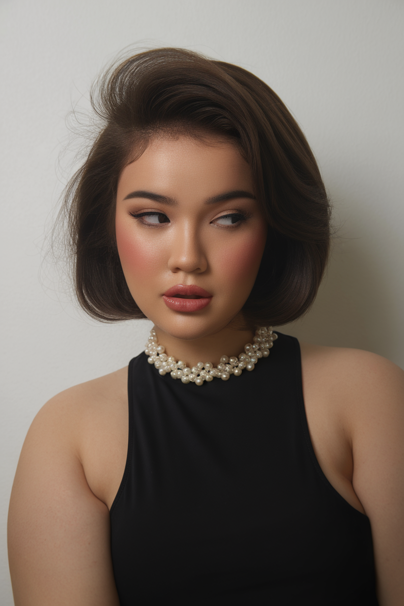 This short bob features a soft, voluminous style with a side-swept lift for a flattering effect. The rich, dark brown color enhances the fullness, making it a great option for round faces. A timeless and modern choice, this cut balances elegance and natural movement.