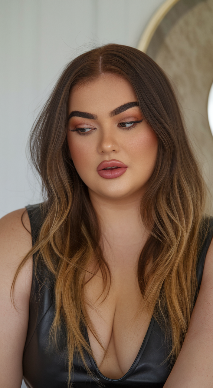 This long hair look features soft, layered waves with a natural ombre transition. The warm brown roots gradually blend into golden ends, creating depth and dimension. A flattering style that enhances movement and complements round faces.