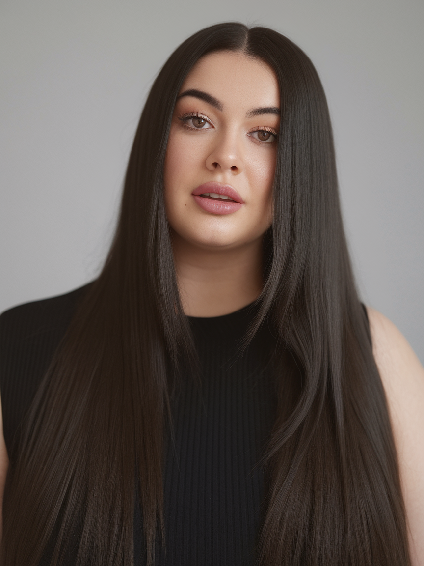 This long hair is styled sleek and straight with a clean middle part for a polished effect. The deep, rich brunette shade enhances shine and smoothness, creating a modern and elegant look. A perfect choice for those who prefer cool, structured styles with minimal layering.