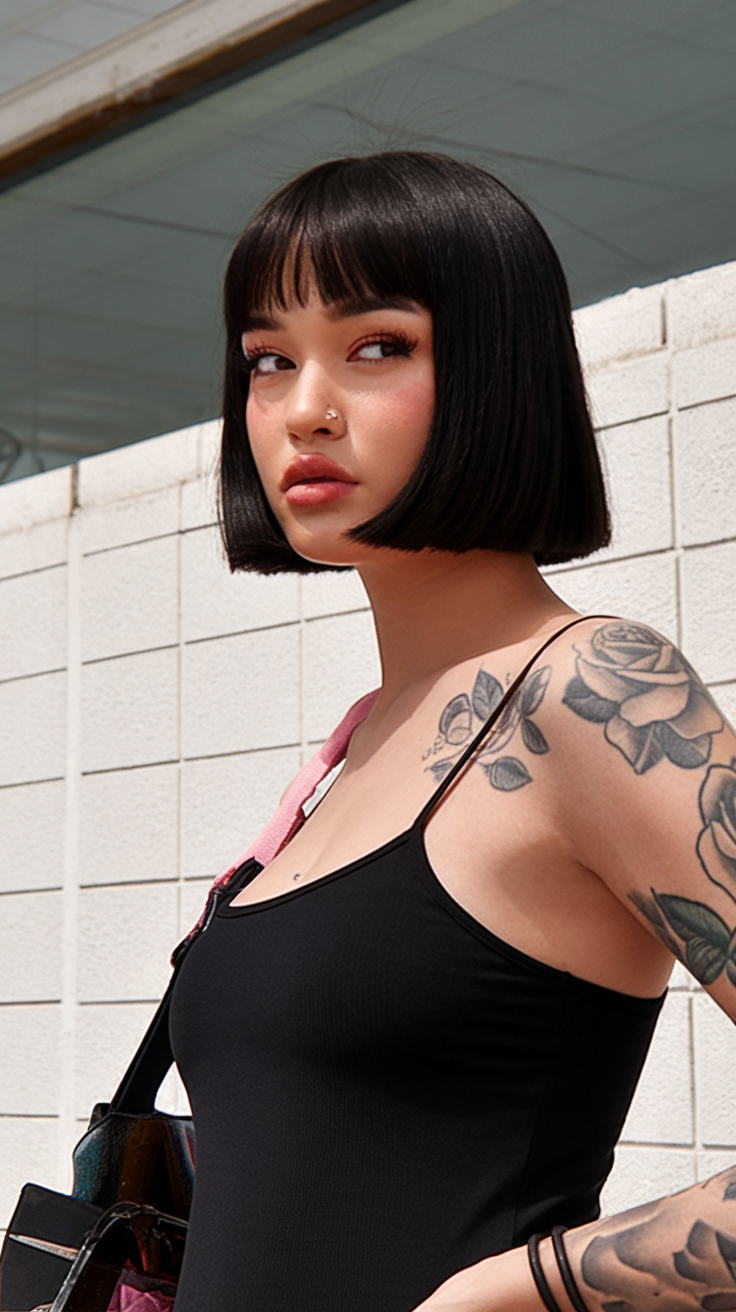 This short bob with straight-across bangs is a striking and edgy choice for women with a square face shape. The shape straight hair cut emphasizes the jawline while the sleek texture keeps the look modern and bold. The deep black shade enhances the sharpness of the cut, making it a strong statement style. This perfect structured bob is ideal for those who love a confident and chic haircut.