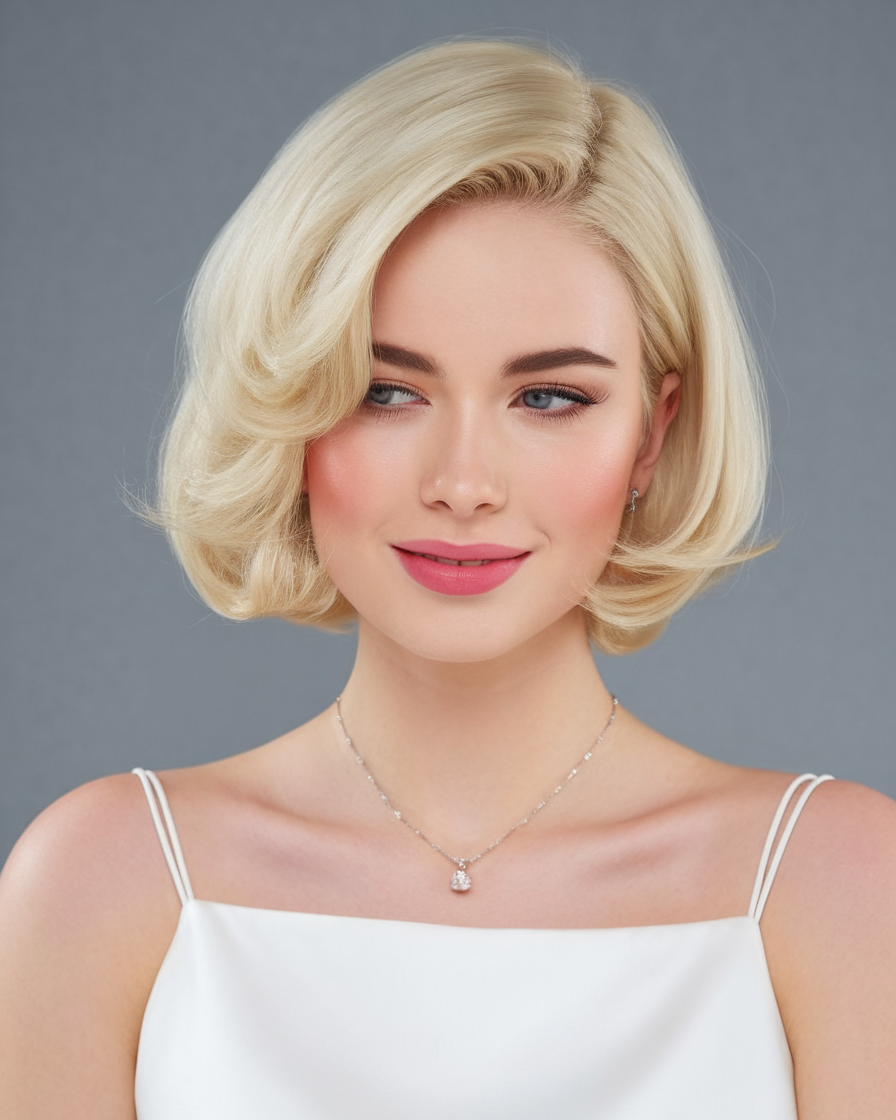 This short bob is a perfect choice for women looking for an elegant and timeless style. The soft, voluminous waves add movement, making it a flattering option for a square face shape. The light blonde color enhances the cut, giving it a fresh and sophisticated feel. The side part creates an effortless lift, balancing strong facial features beautifully.
