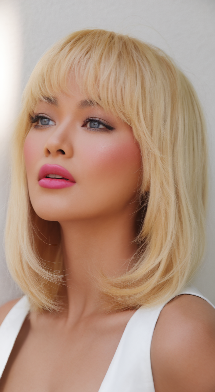 This mid-length cut with wispy bangs is a flattering choice for women looking for a soft yet stylish shape. The subtle layers create movement while the bright blonde shade adds freshness to the look. The shoulder-length shape helps balance the jawline, making it one of the best options for a square face shape. This versatile style works well for both straight and slightly wavy textures.