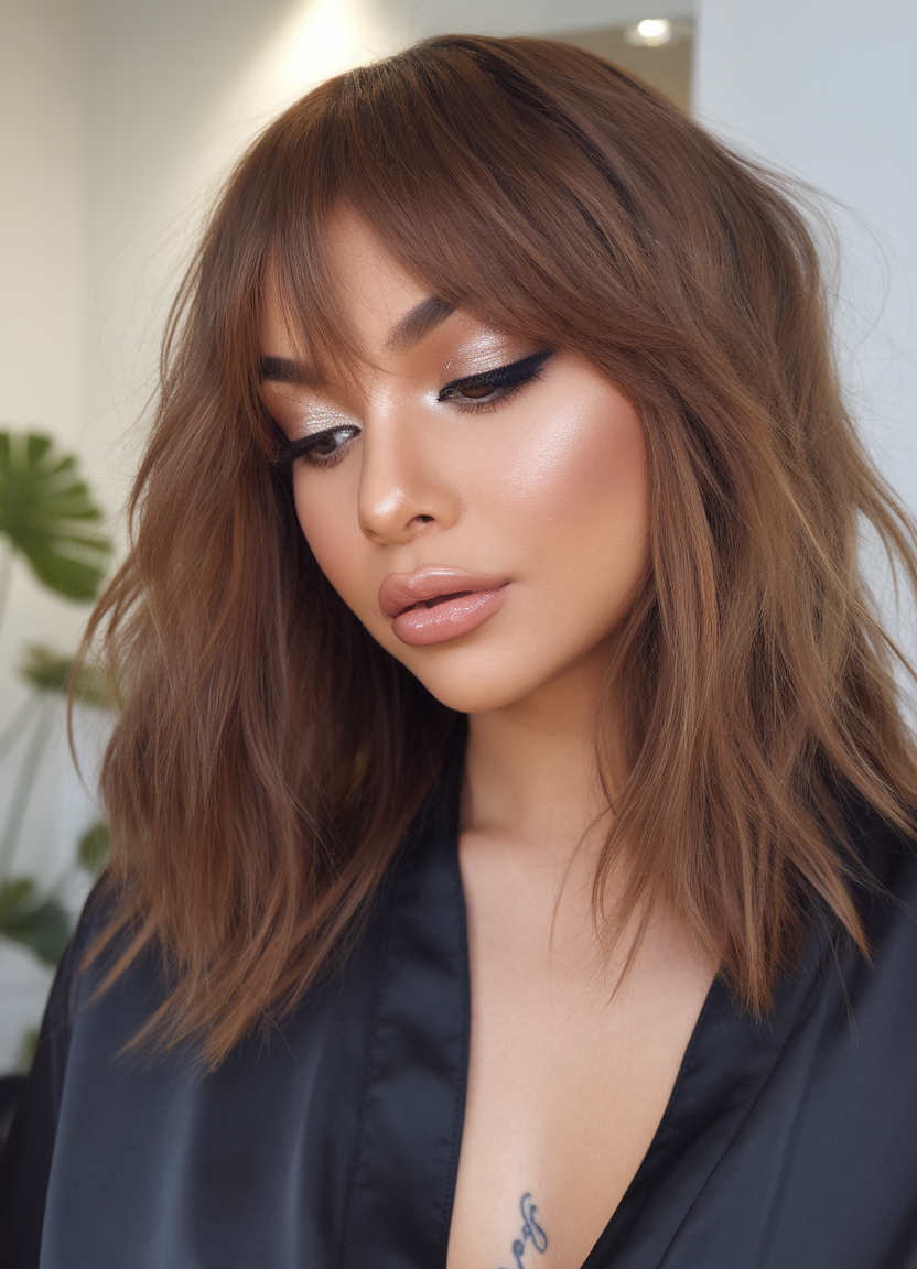 This medium hair cut features choppy layers that add movement and volume, making it a great choice for women with a square face shape. The wispy bangs soften the forehead and frame the face effortlessly. The warm brown color enhances the natural texture, making this a flattering and versatile hairstyle. This shape women medium style is perfect for those who want a trendy yet effortless look.