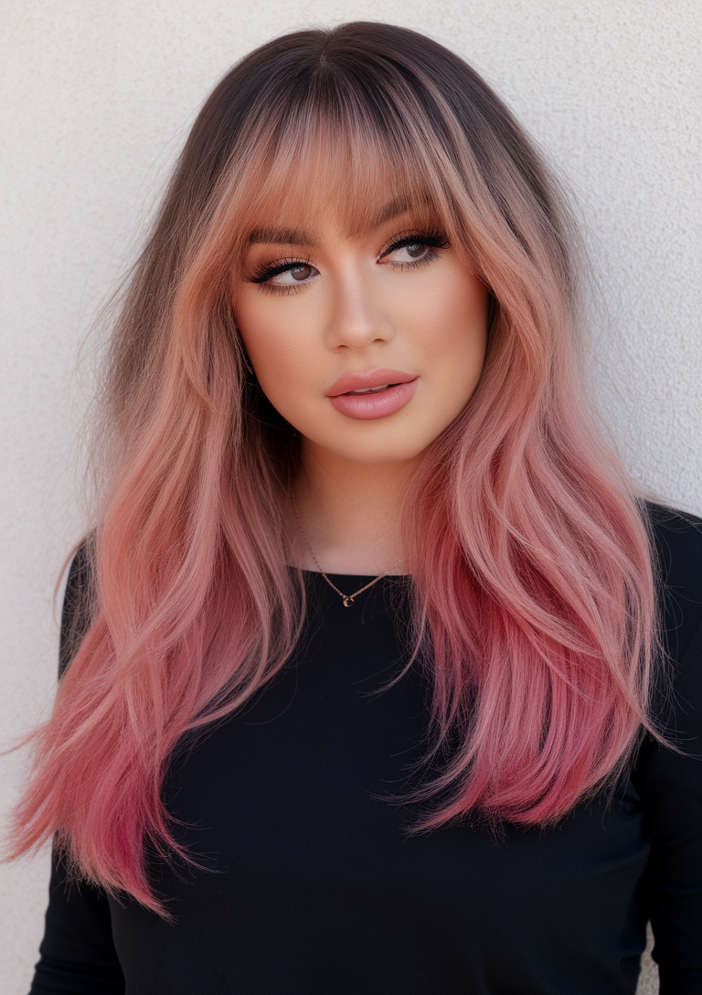 This long, wavy style is a perfect choice for women who love a bold yet feminine look. The pastel ombre blends seamlessly from dark roots to a soft pink hue, adding a modern twist to a classic haircut. The shape long layers give movement, making this an ideal cut for those with medium to thin hair. The flattering curtain bangs complement the overall shape, making this a standout style.