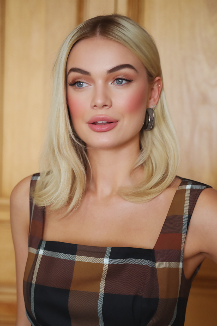 This bob haircut is one of the best choices for a square face, as its mid-length shape frames the face beautifully. The precise blunt cut enhances structure, while the soft inward curve at the ends creates a polished effect. The shape for women with straight or slightly wavy textures offers a sophisticated and timeless appeal. The flattering blonde shade adds brightness and depth, making it ideal for spring.