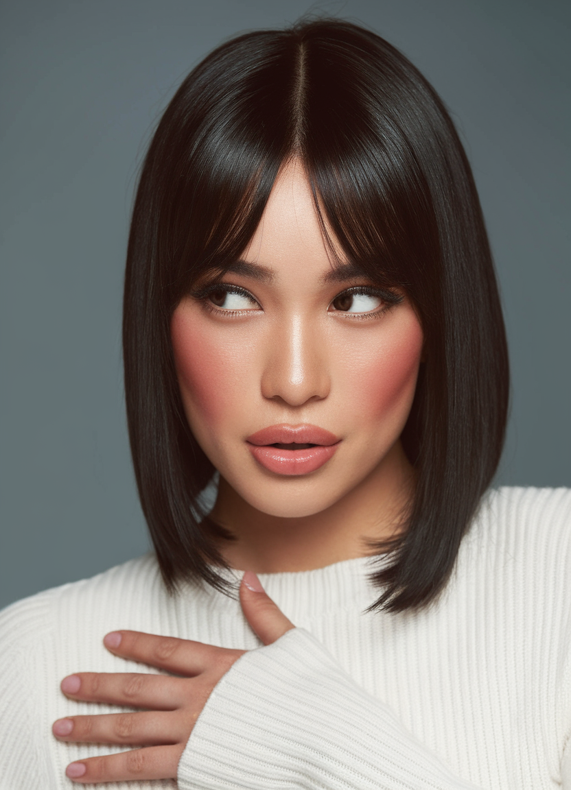 This mid-length bob is a perfect choice for women looking for a polished yet modern cut. The shape straight hair creates a sleek effect, while the wispy bangs add softness to the square face shape. The deep black color enhances the shine, making this a flattering style for any occasion. The slight inward curl at the ends frames the face beautifully.