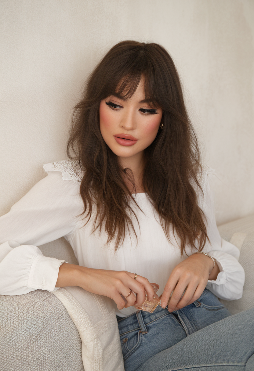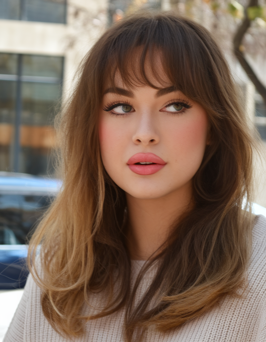 This long, layered haircut with curtain bangs is an excellent choice for women with a square face shape. The soft waves frame the face while adding volume and texture, making it a great style for medium hair. The natural brown tone gives depth, making it an easy-to-maintain look. The shape for women with thin hair allows for a fuller, more voluminous effect.