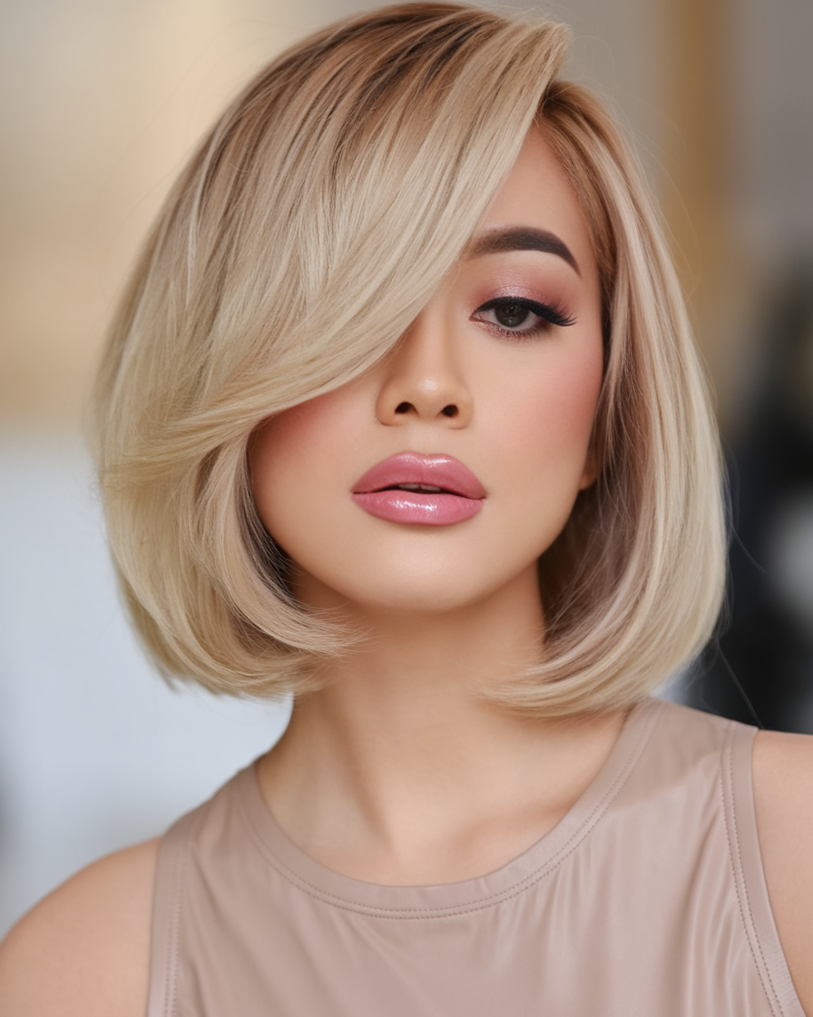 #1 Voluminous Blonde Bob with a Deep Side Part