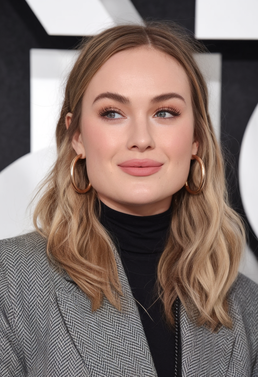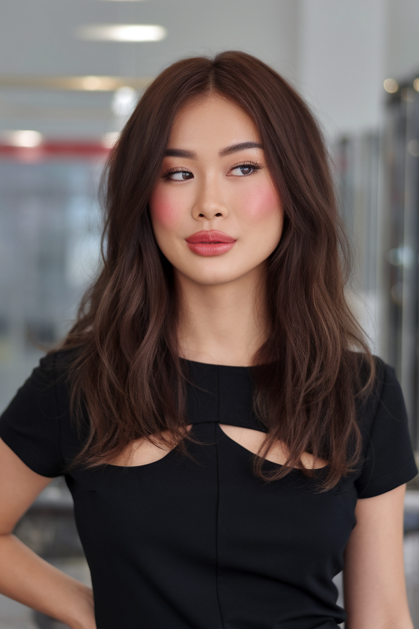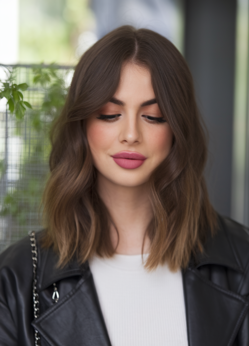 This shoulder-length lob is a great mid-length style for women looking for a balance between sophistication and effortless movement. The subtle waves soften a square face shape, while the center part enhances symmetry. The layered ends create volume, making it a great choice for those with thin hair seeking added fullness. This shape women medium style works well for everyday wear while staying on-trend.