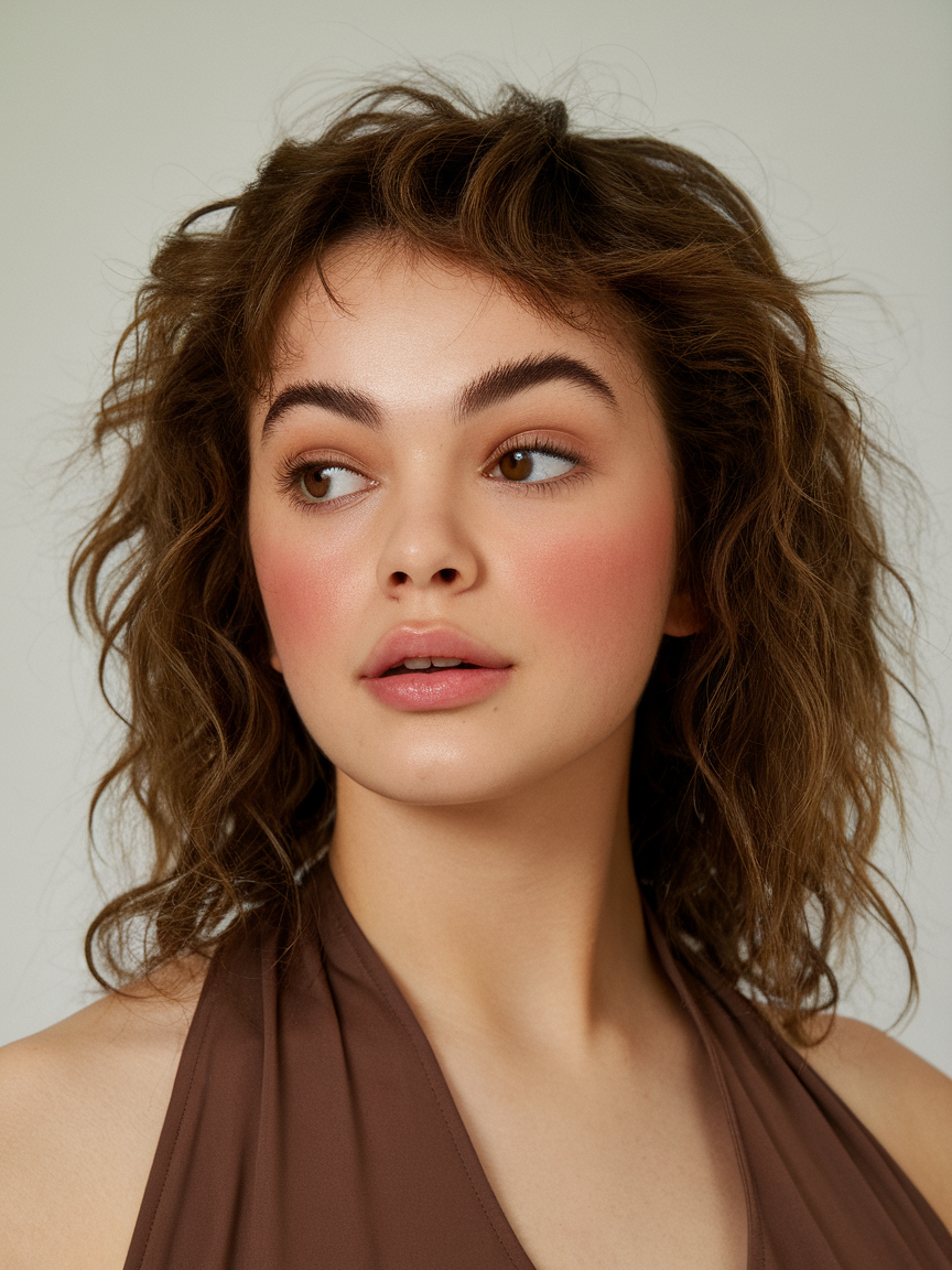 This medium length cut is ideal for shape women curly, featuring natural waves that add volume and softness. The warm brown shade enhances the texture, while the soft, airy bangs frame the face beautifully. This style balances a triangle face shape, making it one of the best options for a relaxed yet stylish look in spring haircuts for triangle face ideas 2025.