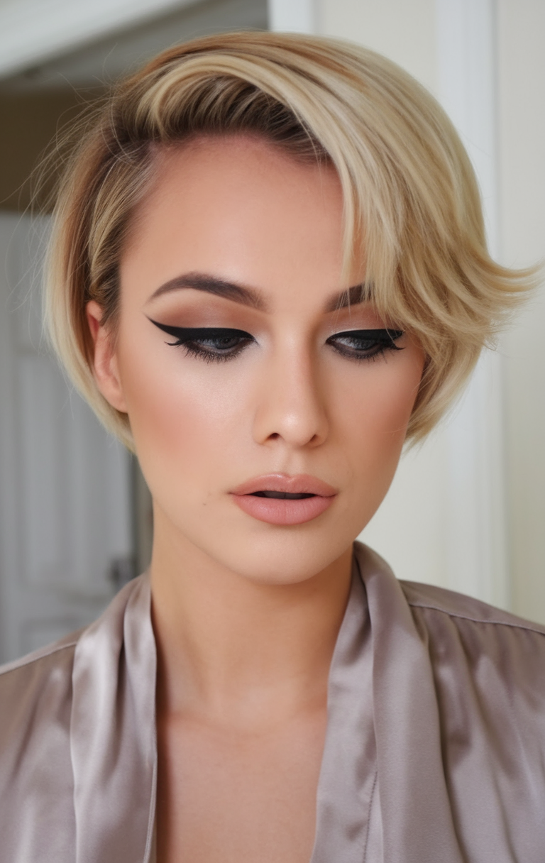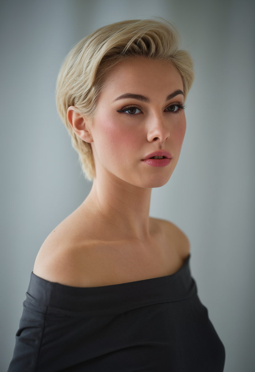 This short pixie cut is styled with a voluminous swept-back look, giving a sophisticated and modern edge. The warm blonde hue adds dimension, making it a great choice for shape for women short styles. This haircut complements a triangle face shape by enhancing the cheekbones and elongating the face. A perfect pick for those seeking elegance in spring haircuts for triangle face ideas 2025.