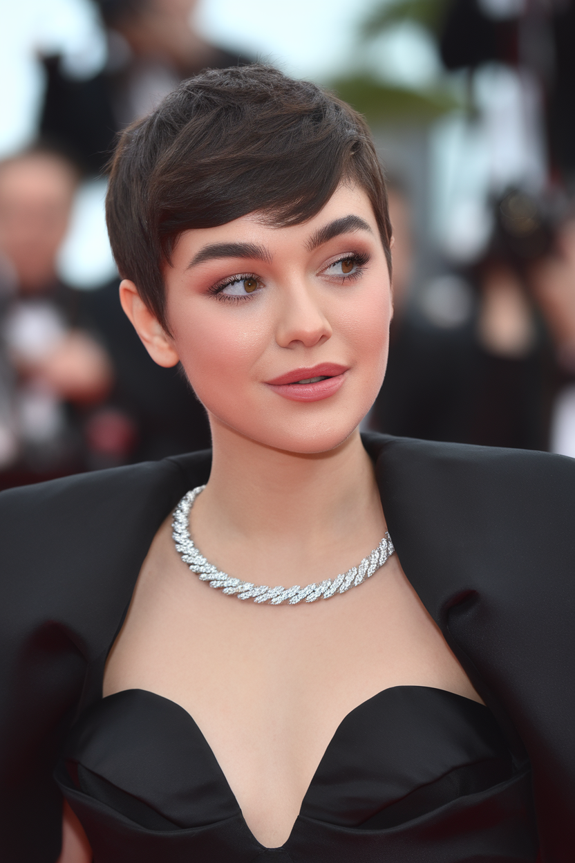 This short pixie cut features soft, textured layers that frame the forehead while maintaining volume on top. The slight fade at the sides balances a triangle face shape, making it an excellent shape for women short styles. The deep brunette shade adds richness and dimension, perfect for those wanting a low-maintenance yet trendy look in spring haircuts for triangle face ideas 2025.