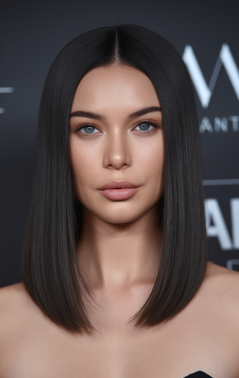 This medium length blunt cut is a sophisticated and polished look for shape women straight hair. The jet-black shade enhances the sleek, sharp finish, while the precise middle part balances a triangle face shape. This style is one of the best for those who prefer a minimalist and modern haircut in spring haircuts for triangle face ideas 2025.