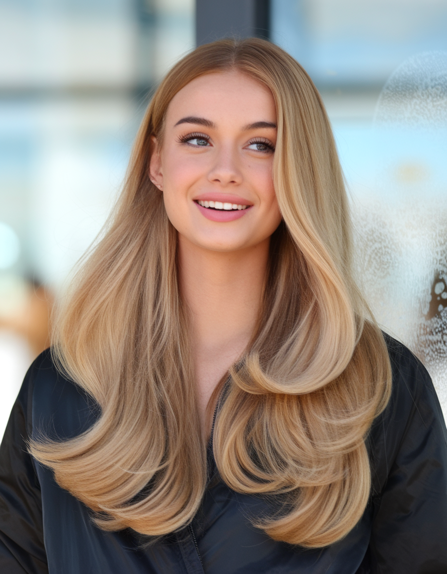 This medium length to long haircut features soft, voluminous layers that frame the face beautifully. The warm blonde shade with subtle highlights adds dimension, making it an ideal shape for women medium. The soft curls enhance movement, making this style perfect for spring haircuts for triangle face ideas 2025 for a romantic and effortless look.