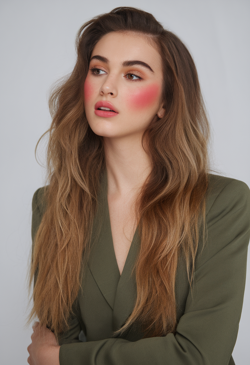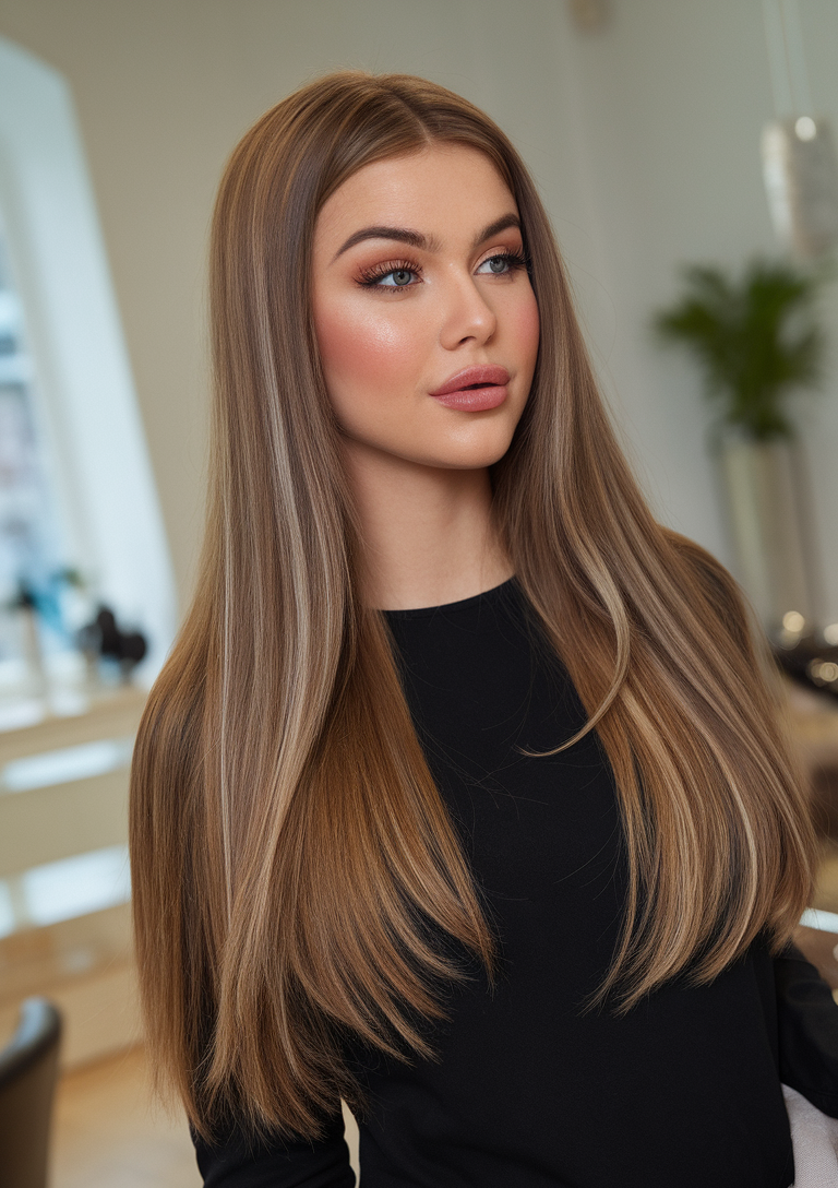 This medium length to long cut features smooth, sleek layers with a blended balayage effect. The warm brown and caramel tones create depth, making it a versatile shape for women medium style. The long, straight layers keep the look elegant, making it a best choice for polished and modern spring haircuts for triangle face ideas 2025.
