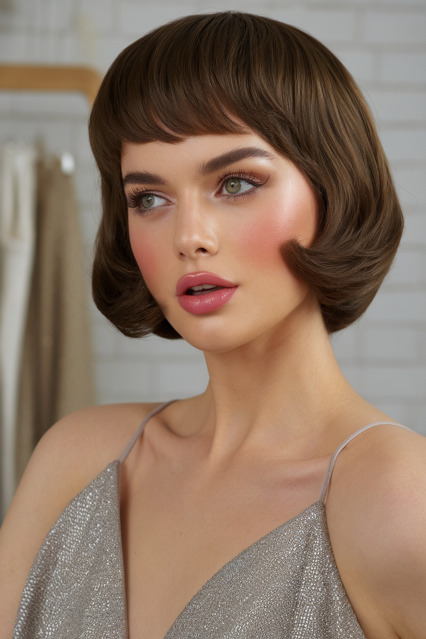This short bob features a rounded shape with softly curled ends, adding a vintage-inspired flair to spring haircuts for triangle face ideas 2025. The deep brown shade gives it a sophisticated touch, while the baby bangs highlight the cheekbones and balance a triangle face shape. This is a perfect shape for women short look for those who love classic yet modern hairstyles.