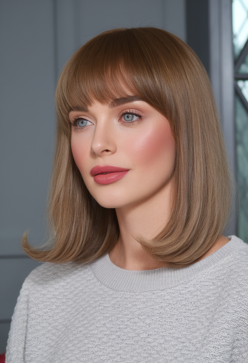 This medium length lob is styled with a smooth finish and slightly flipped ends, making it one of the best choices for shape women straight hair. The light brown shade with subtle highlights creates depth and shine, while the soft, full bangs frame the forehead beautifully. A refined yet effortless option for spring haircuts for triangle face ideas 2025.