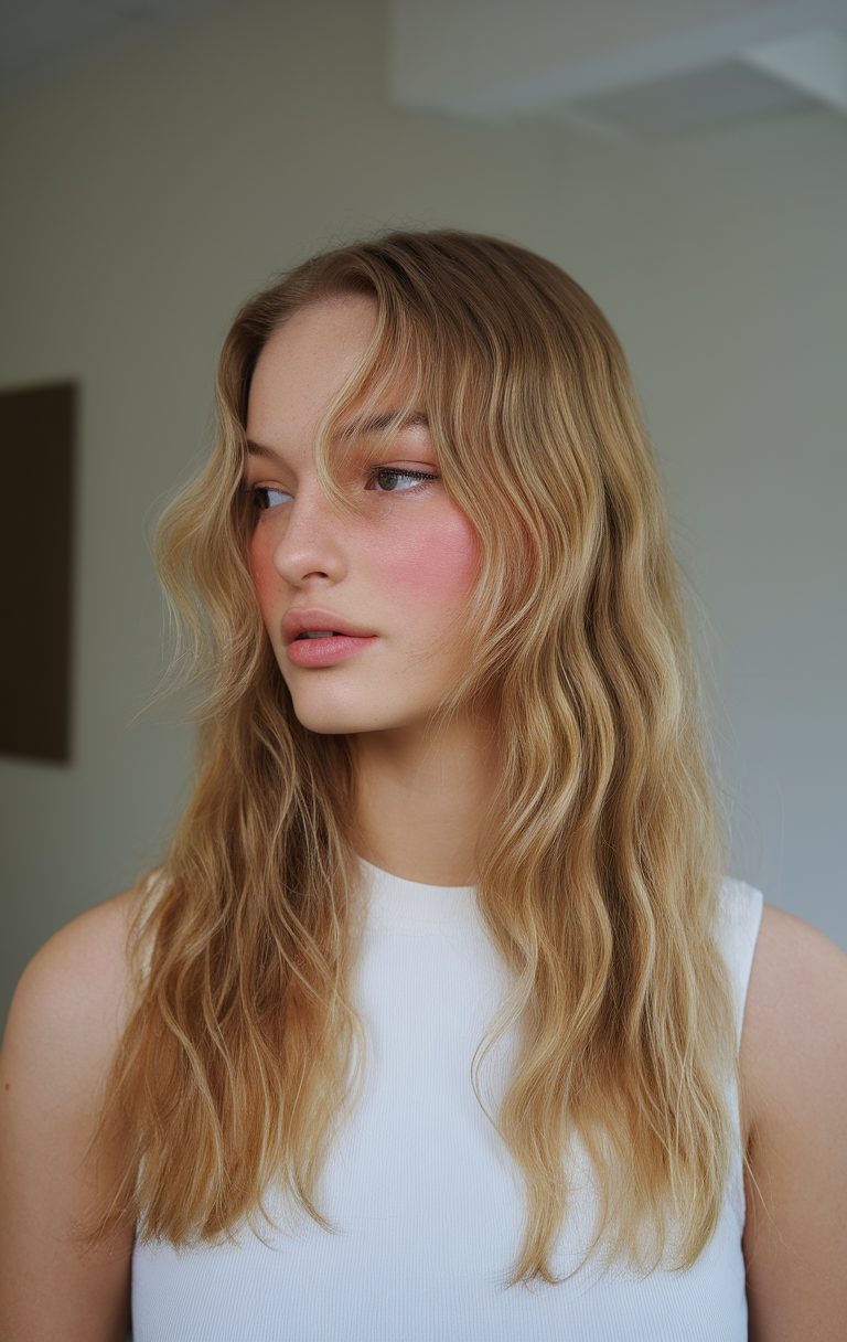 This medium length cut showcases effortless beachy waves with a soft golden blonde hue. The slightly tousled texture makes it a great shape women curly style, enhancing natural movement and volume. The middle part keeps the look modern and balanced, making it a fresh choice for spring haircuts for triangle face ideas 2025.