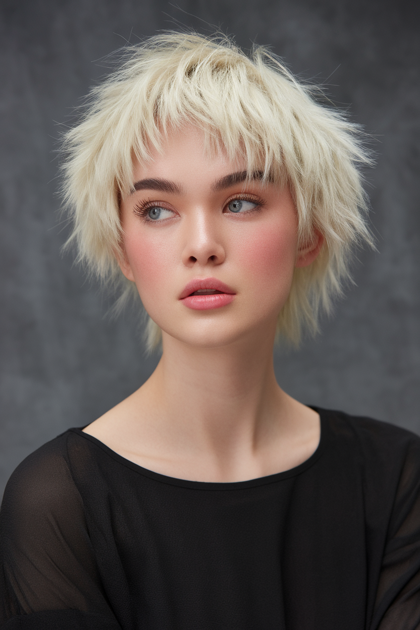 This short shag cut features heavily textured layers and a platinum blonde tone for a bold, modern edge. The feathery finish creates volume and movement, making it a dynamic shape for women short look. This style is perfect for those wanting an edgy, high-fashion take on spring haircuts for triangle face ideas 2025.