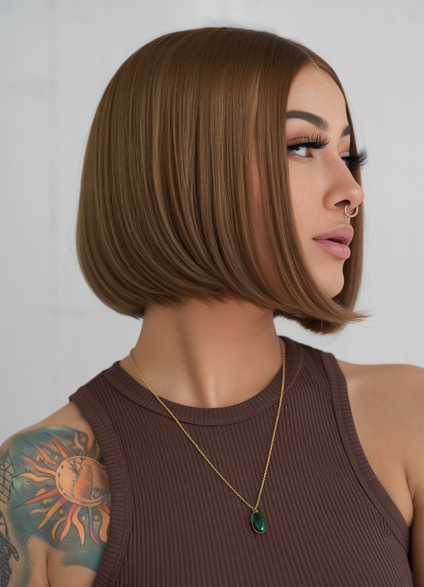 This short bob features a precise, sleek finish with a slight inward curve at the ends. The warm brown shade enhances the polished look, making it a perfect shape for women short option. The clean structure of this cut balances a triangle face shape, making it one of the best choices in spring haircuts for triangle face ideas 2025.