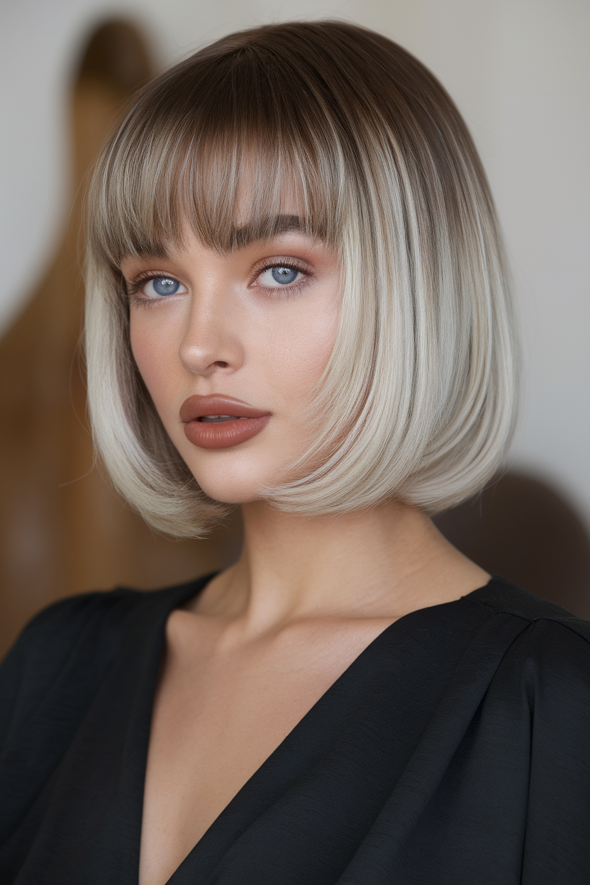 This short blunt bob is elevated by a cool ombre transition from deep brown to icy blonde. The soft bangs add structure, making it a flattering shape for women straight hair choice. The precise length and smooth texture make this style modern and fresh in spring haircuts for triangle face ideas 2025.