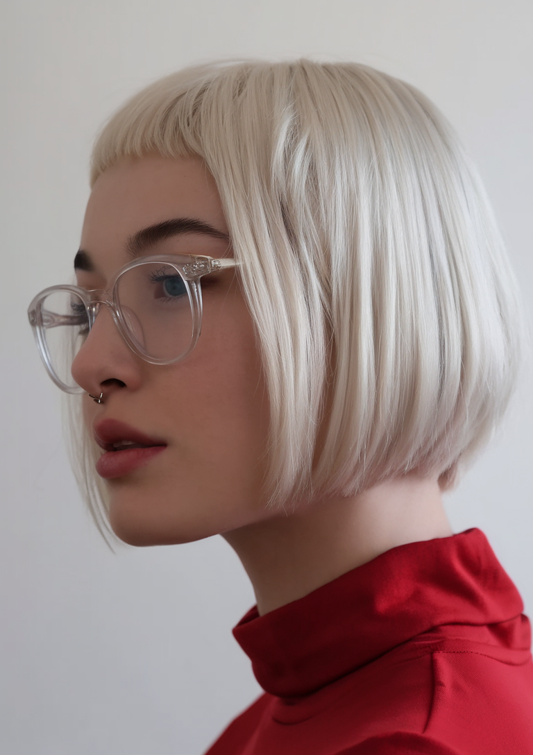 This short blunt bob is a sleek and modern choice for shape women who love sharp lines. The crisp platinum blonde shade enhances the structured cut, while the baby bangs add an edgy, contemporary touch. This shape for women short style works well for balancing a triangle face shape, drawing attention to the eyes and cheekbones. It’s an effortlessly chic option in spring haircuts for triangle face ideas 2025.
