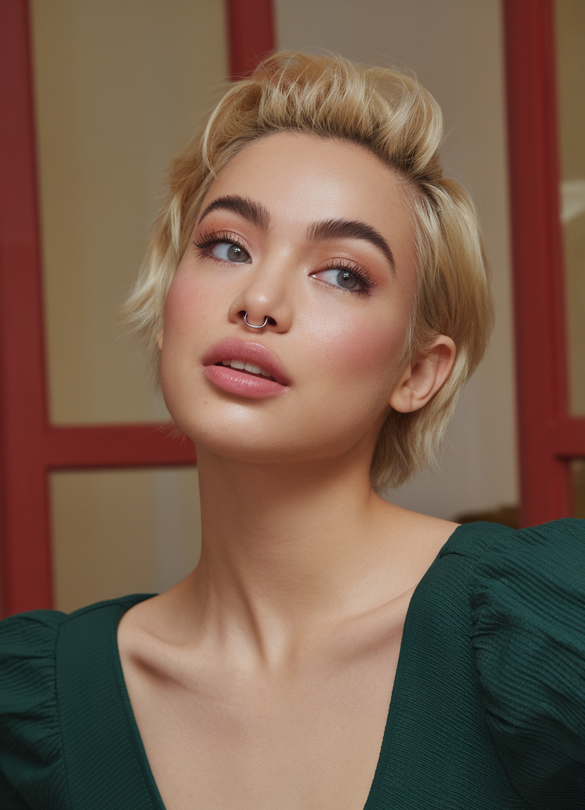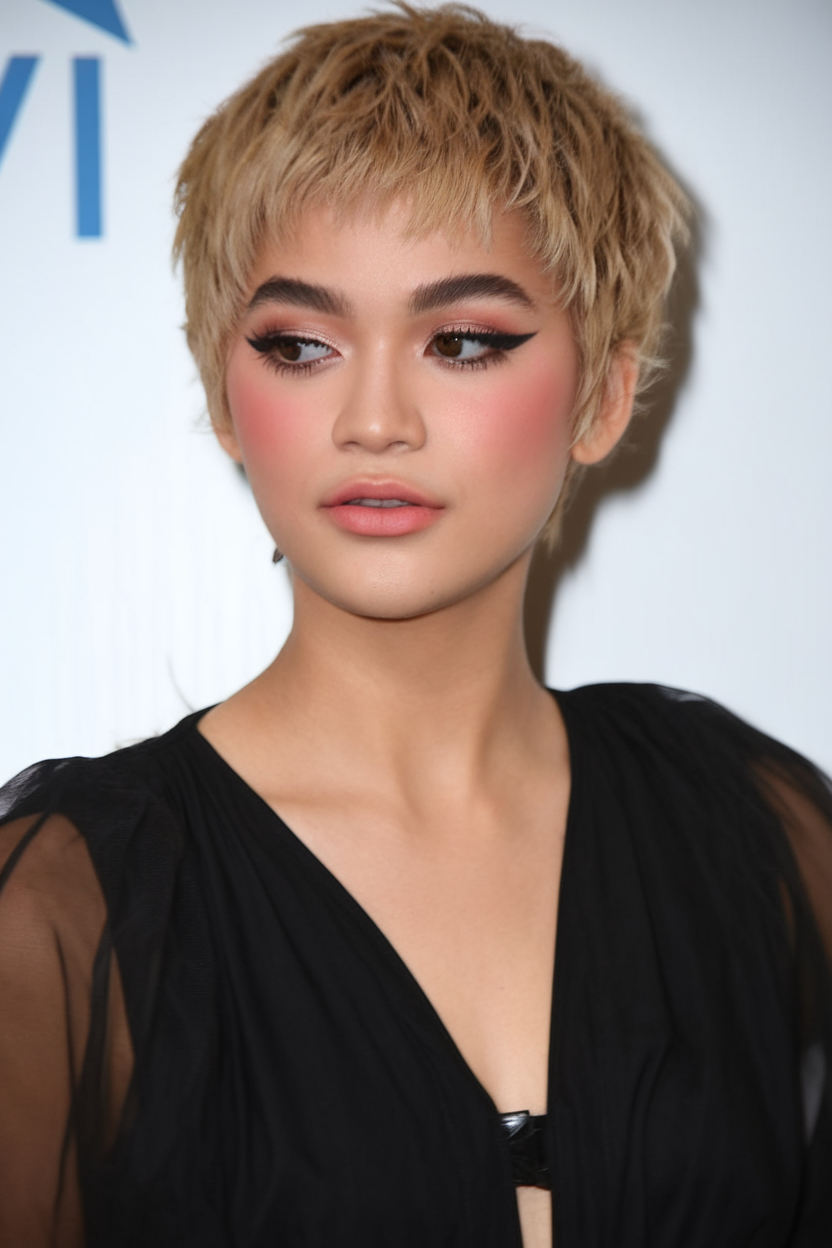 This short pixie cut features choppy layers that create movement and texture, making it a dynamic choice for shape women fade styles. The soft golden blonde hue brightens the face, while the feathered layers add volume at the crown, complementing a triangle face shape. A perfect shape for women short option, this cut is both bold and feminine, ideal for those who want an easy-to-style yet statement-making look.