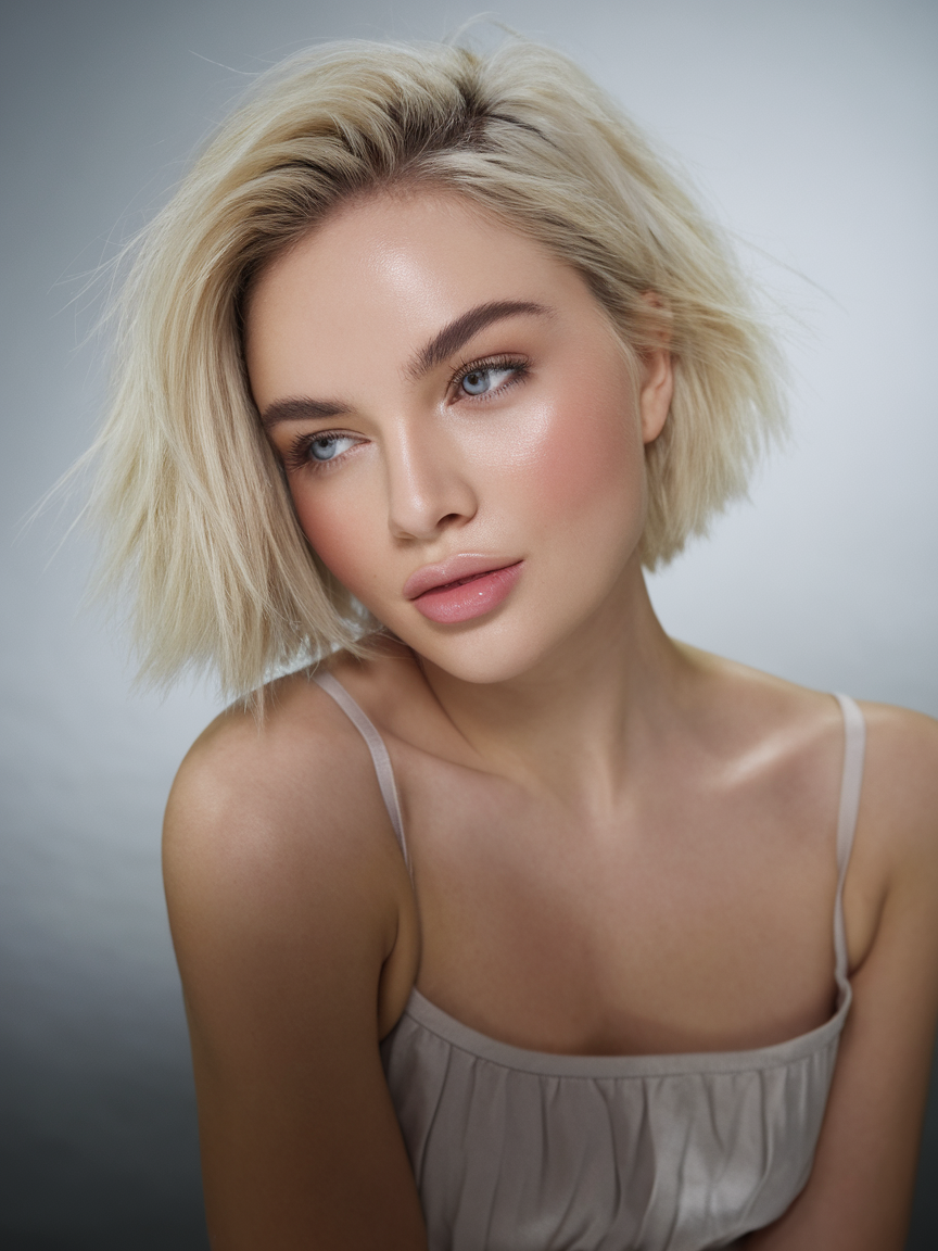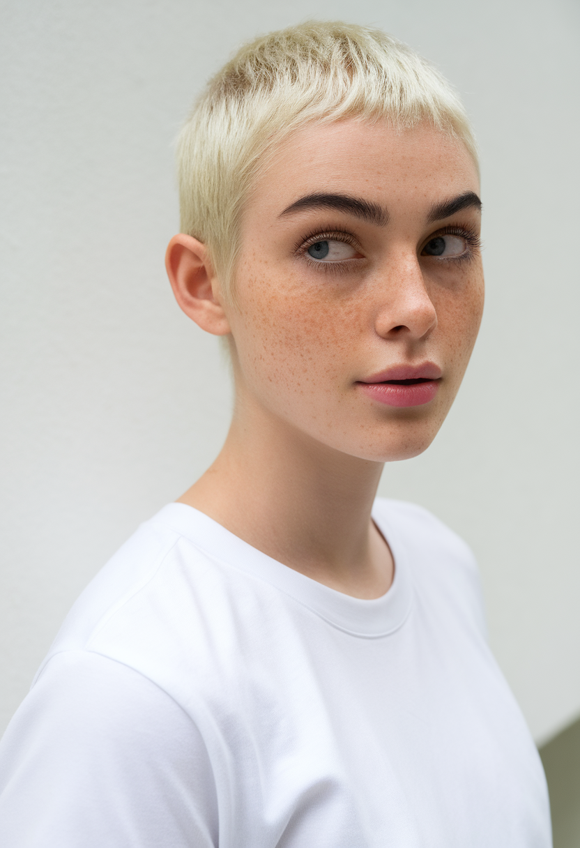This ultra-short buzz cut is a bold and confident choice, perfectly suited for shape women straight hair. The platinum blonde color enhances the edgy appeal, while the clean lines make this shape for women short look sharp and minimal. With its low-maintenance styling, this haircut is a standout in spring haircuts for triangle face ideas 2025 for those embracing a daring transformation.