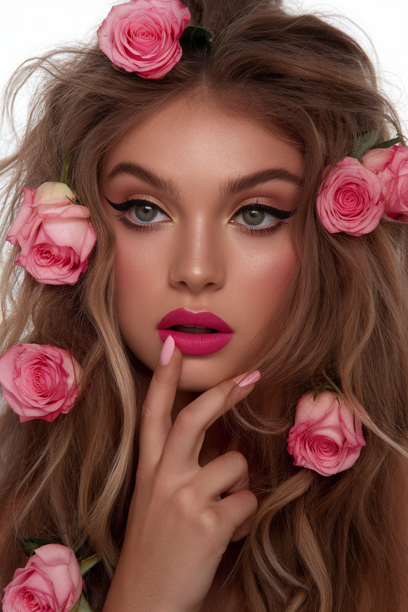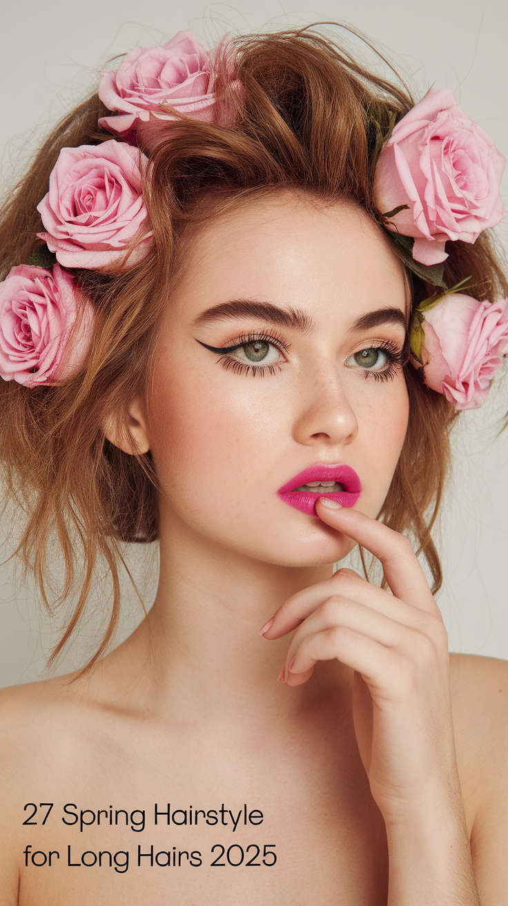 This spring-inspired hairstyle features long, voluminous waves that create a soft and romantic look. The light brown hair with subtle highlights enhances dimension, making it one of the best 2025 hairstyles for a fresh, effortless appeal. Large pink floral accents woven into the waves add a delicate and feminine touch. This trendy spring hairstyle is a great choice for those with medium to long hair, bringing a fresh and modern twist to classic waves.