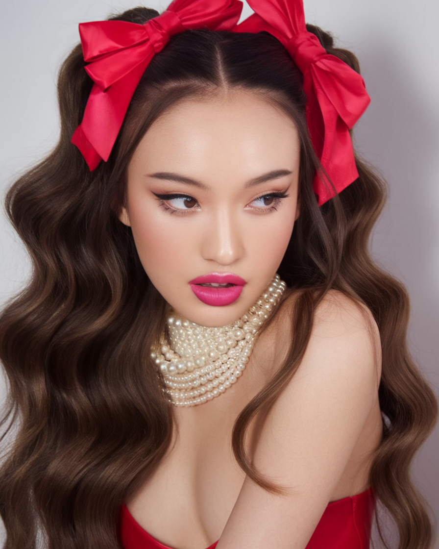 This trendy spring hairstyle features long, voluminous waves that add movement and dimension. The rich brown color enhances the hair’s shine, making it a perfect option for modern, everyday wear. Large red bows elevate the style, adding a playful yet sophisticated touch. This look is ideal for women over 30 who want a youthful, yet elegant way to wear their long hair.
