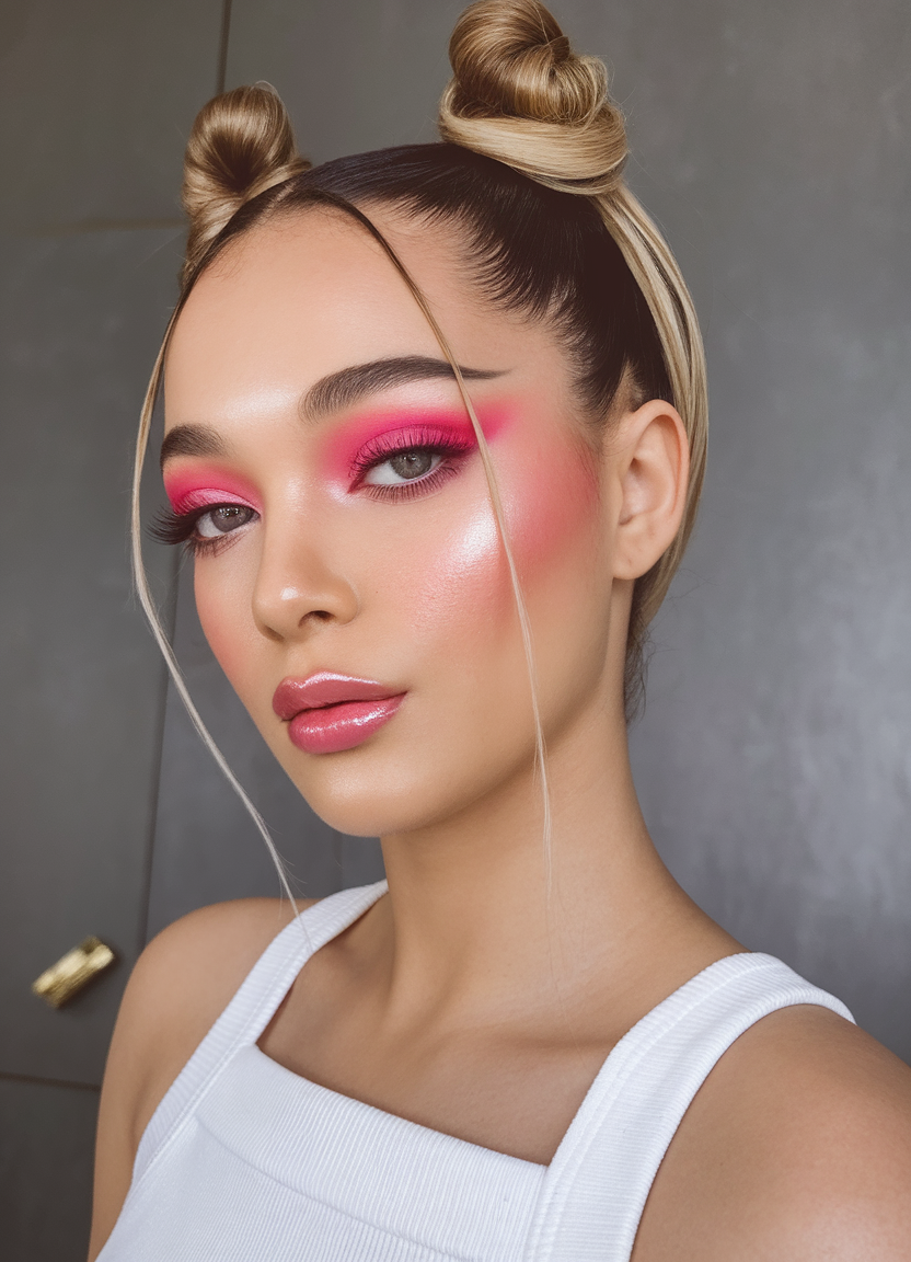 This modern and stylish hairstyle features two sleek space buns, making it a trendy 2025 hairstyle for women over 30 who want a playful yet sophisticated look. The blonde highlights contrast beautifully against the darker base, adding depth and dimension. Delicate face-framing strands soften the style, making it flattering for oval and round faces. This look is perfect for spring, combining a modern touch with an effortless feel.