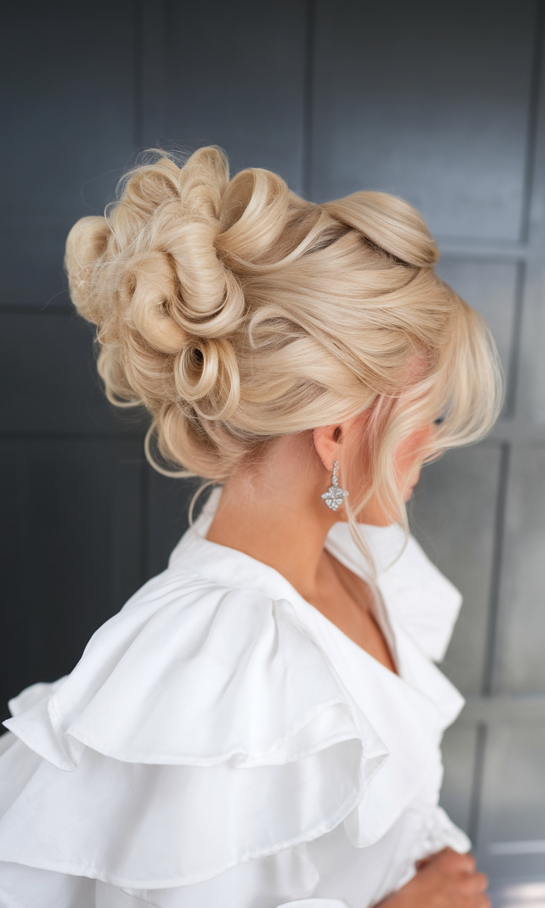 This voluminous updo is a trending 2025 hairstyle that blends elegance with a soft, romantic touch. The blonde curls are sculpted into an intricate style, giving it a modern and timeless appeal. Loose waves gently frame the face, making it a perfect choice for round faces. This spring hairstyle is ideal for special occasions, bringing a trendy yet effortless look to women over 30.