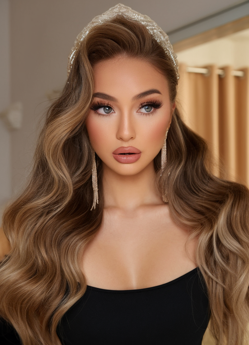 This long, voluminous hairstyle showcases classic Hollywood waves, perfect for a modern yet elegant look. The rich brunette base with warm blonde balayage highlights enhances dimension and shine. A sparkling headband adds a touch of luxury, making it an excellent choice for special occasions and trendy spring hairstyles. This 2025 hairstyle is ideal for women over 30, offering a sophisticated yet effortless look.
