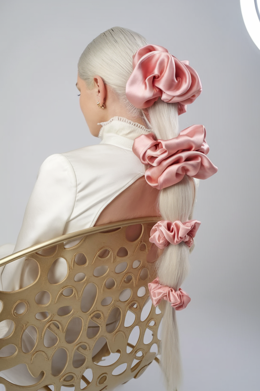 A long and voluminous bubble ponytail takes center stage in this modern spring hairstyle. The icy platinum blonde hair gives it a striking, high-fashion appeal, while oversized satin scrunchies add a feminine and romantic touch. This trending 2025 hairstyle is perfect for women over 30 who want a unique yet elegant updo. The structured ponytail enhances facial features, making it a great choice for oval and round faces.